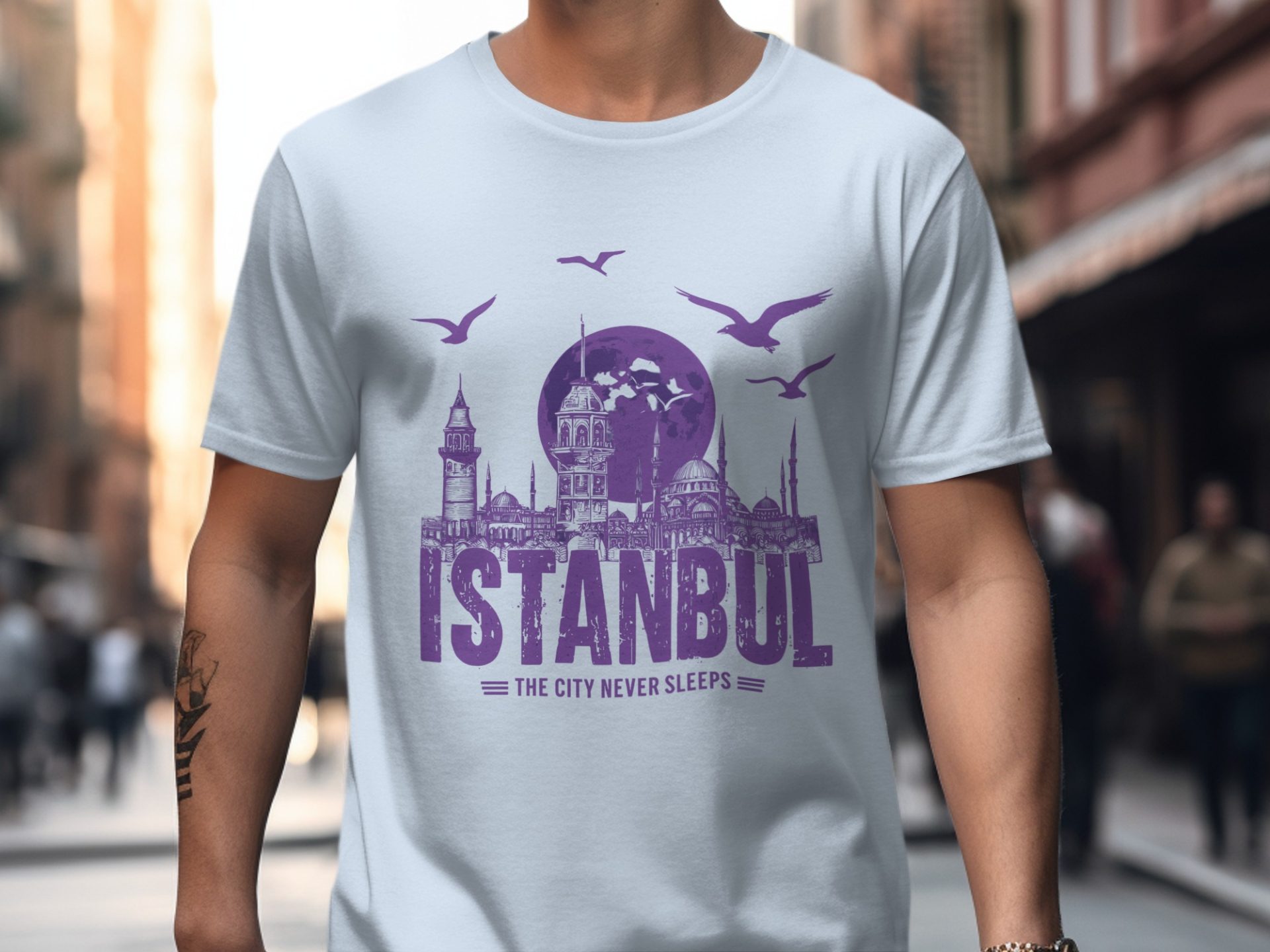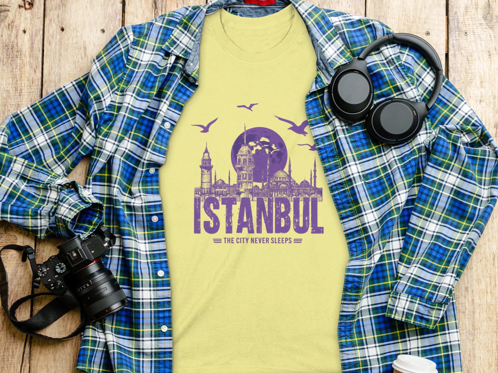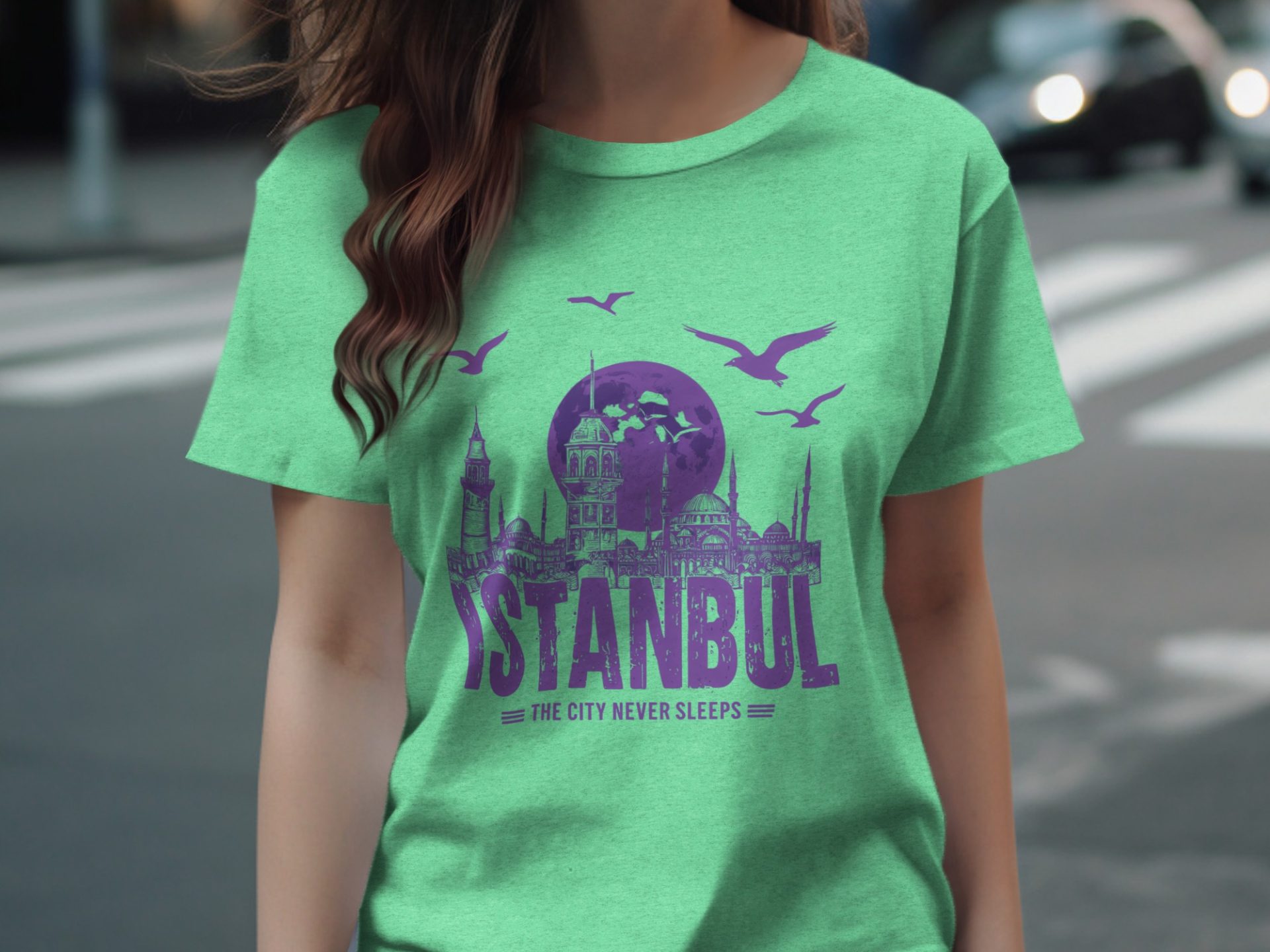 Show your love for Istanbul with this unique graphic T-Shirts design featuring Istanbul skyline and the famous phrase "The City Never Sleeps". Check out this cool apparel today!