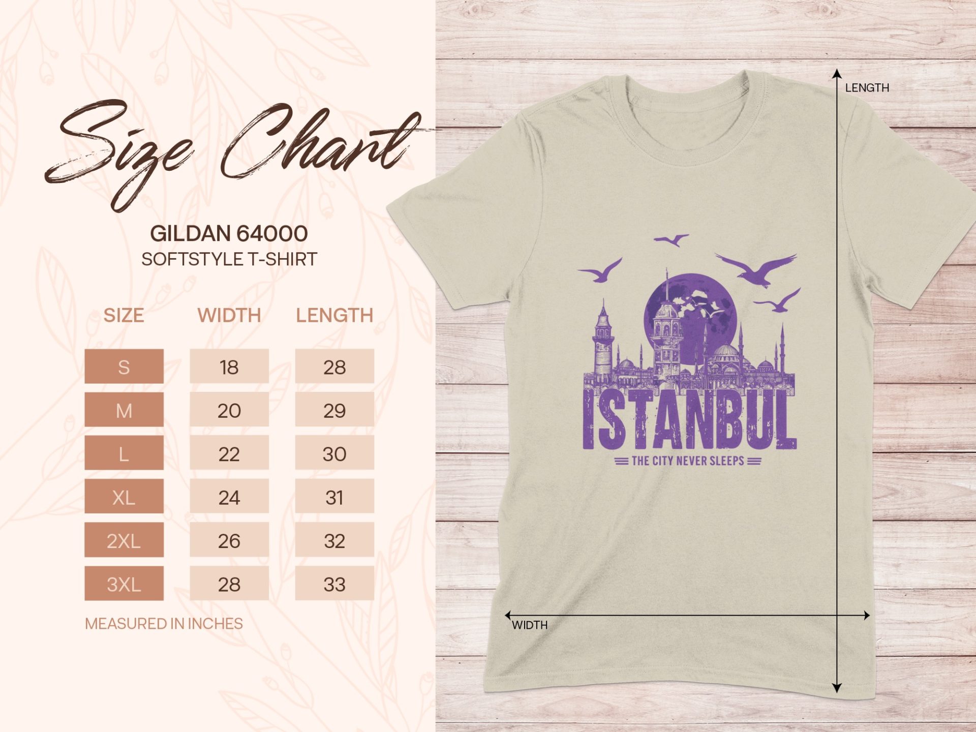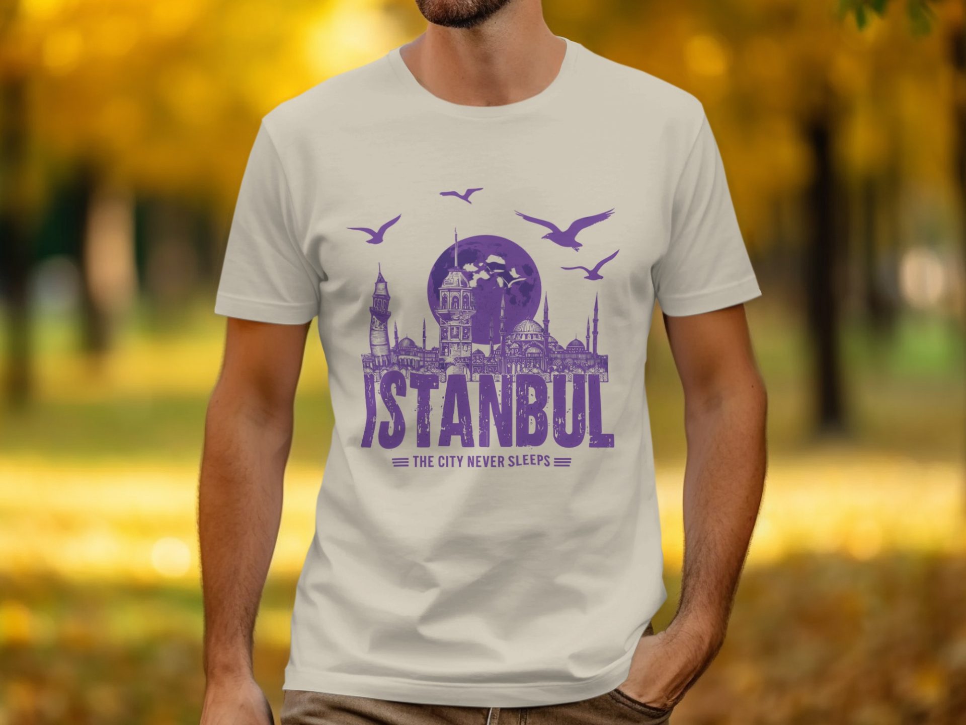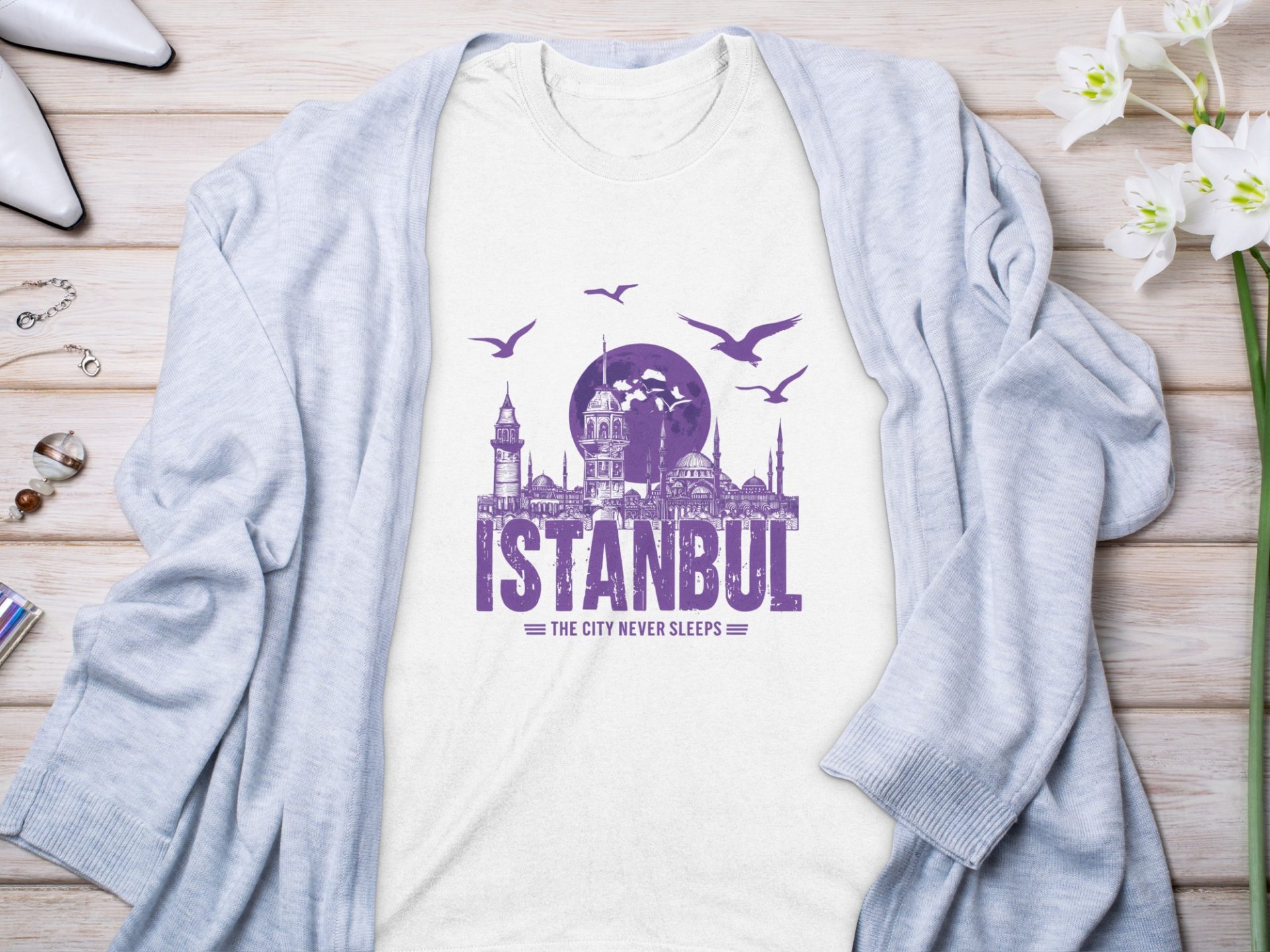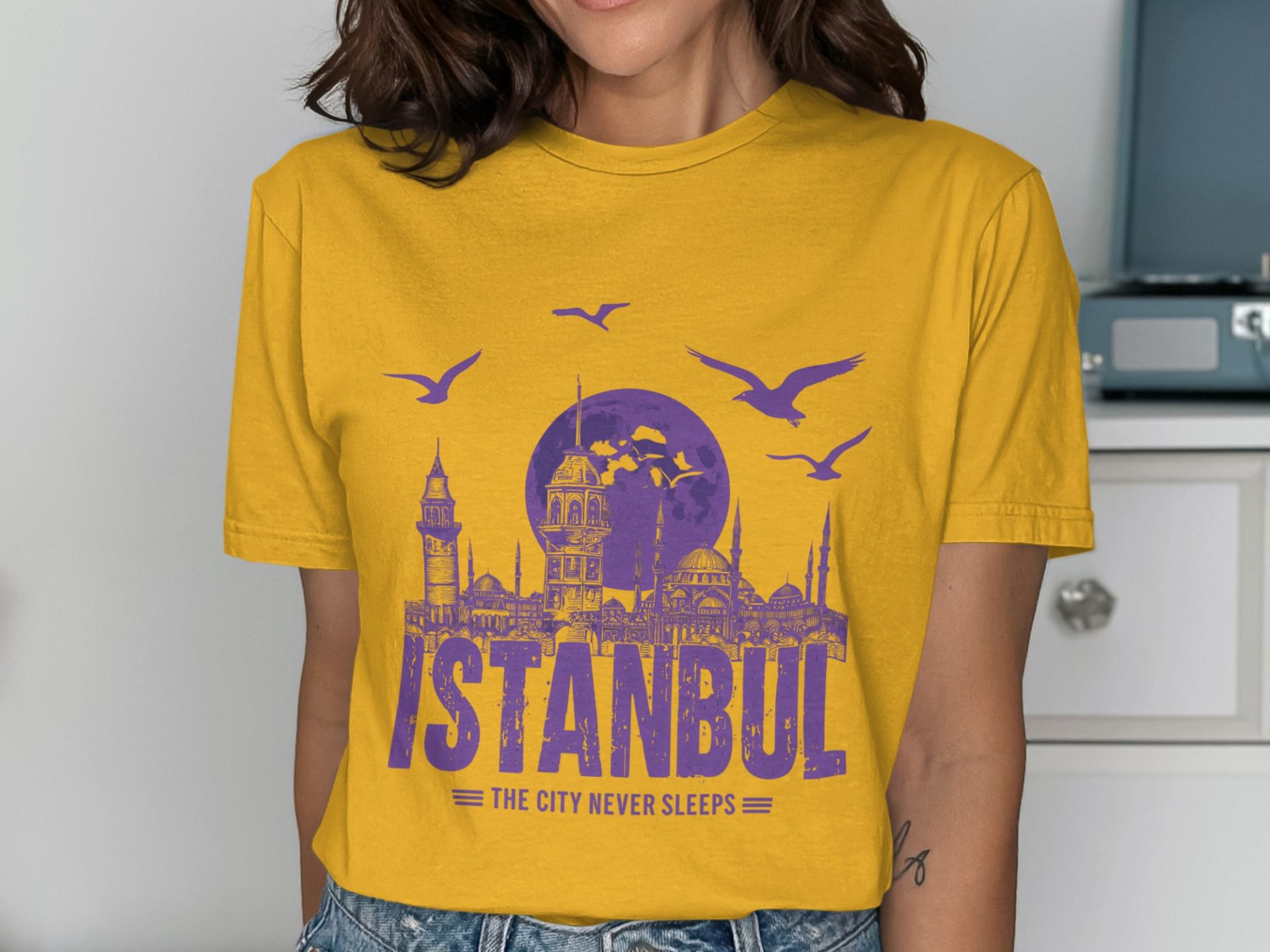Show your love for Istanbul with this unique graphic T-Shirts design featuring Istanbul skyline and the famous phrase "The City Never Sleeps". Check out this cool apparel today!