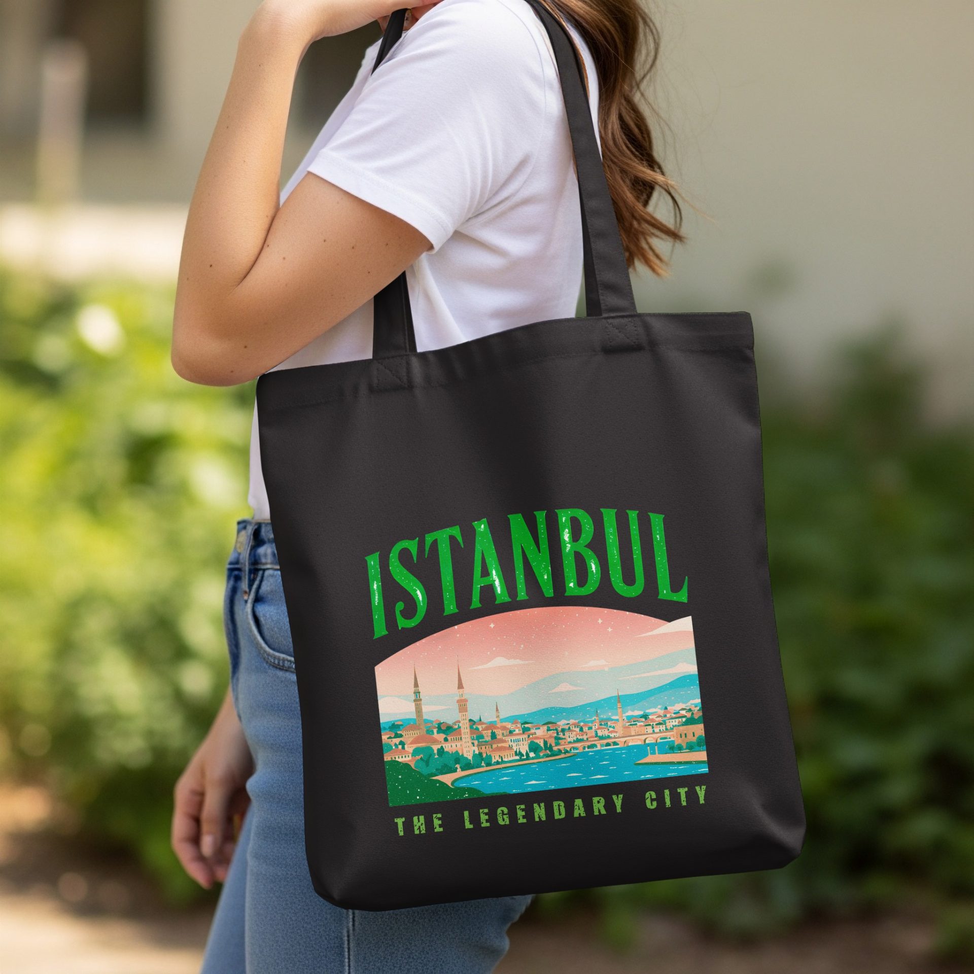 Istanbul the legendary city on a tote bag featuring a beautiful landscape. This artful design is a must-have for travel enthusiasts. Get yours today and carry a piece of Istanbul.