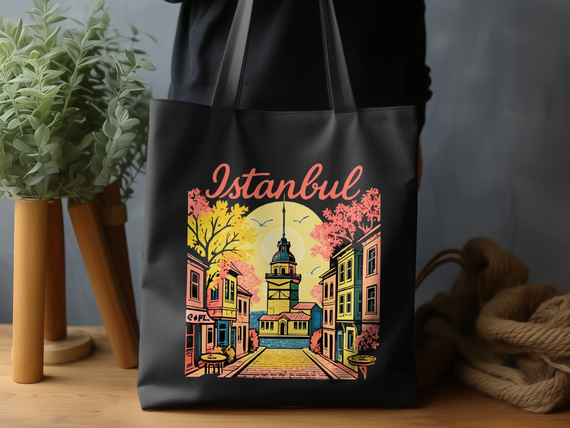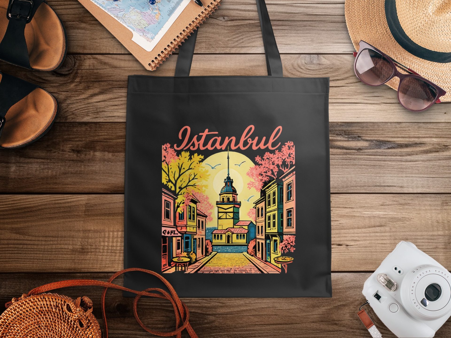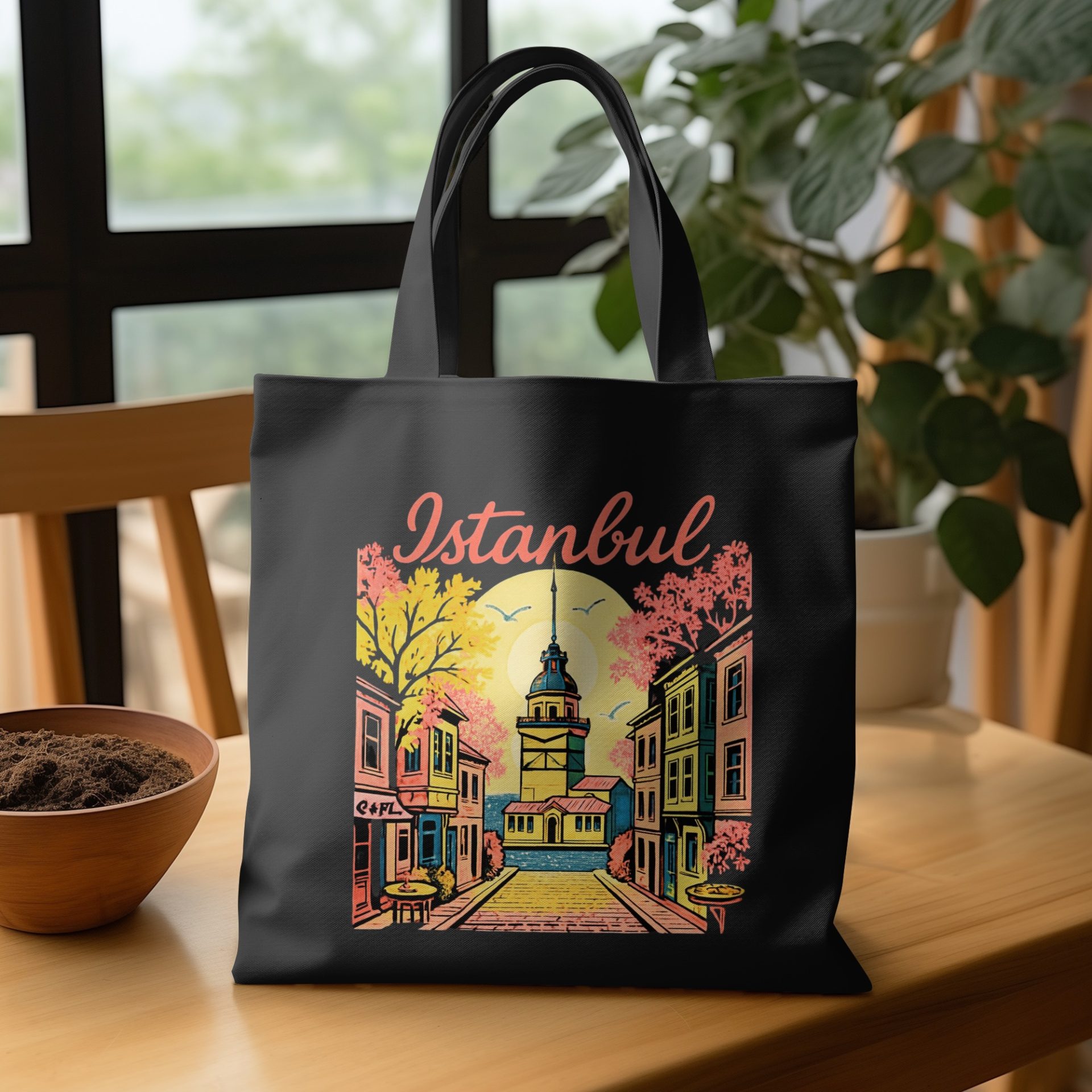 Explore Istanbul with this vintage-style art illustration on our tote bags. Featuring Istanbul Tower surrounded by colorful buildings and calm waters. Perfect for travel lovers!