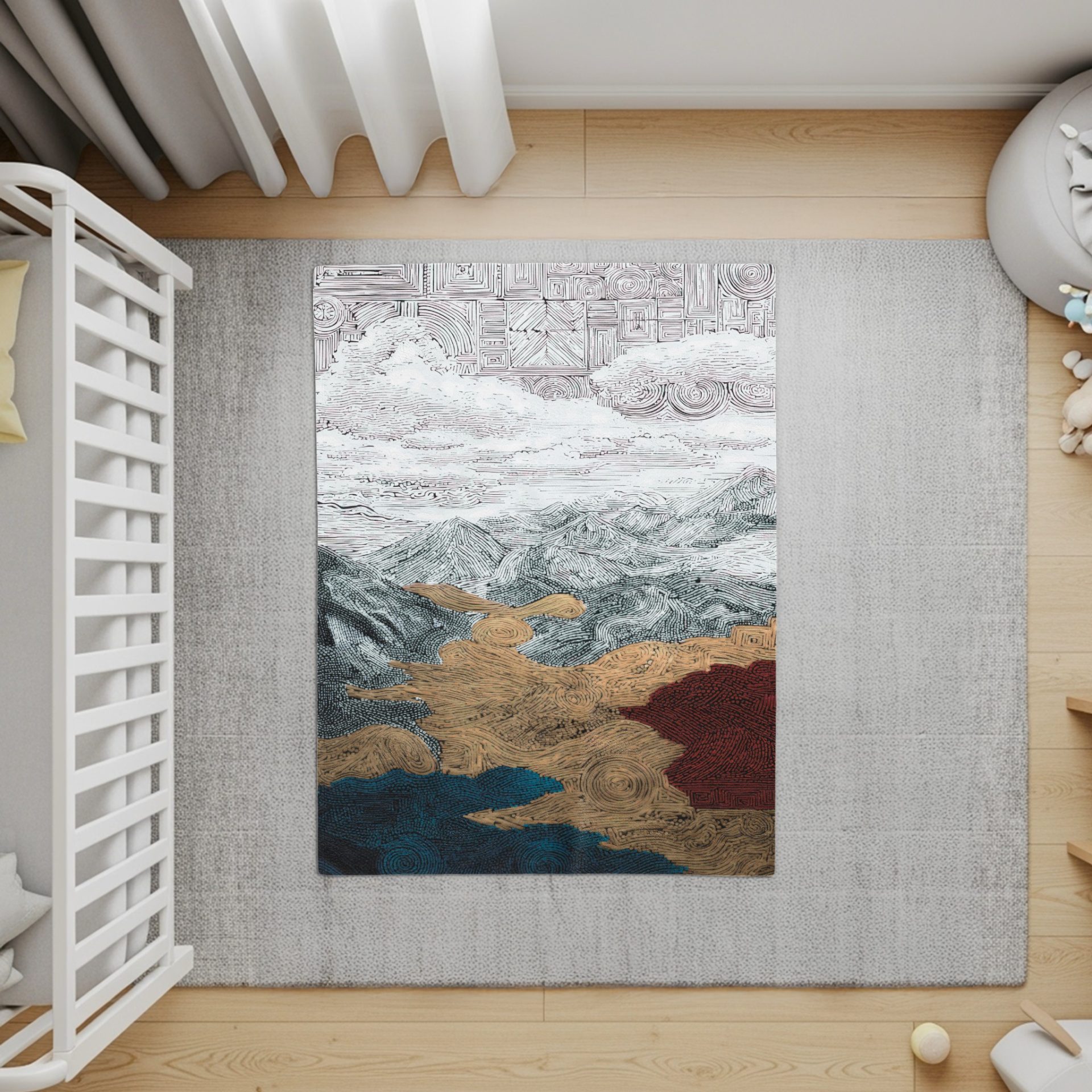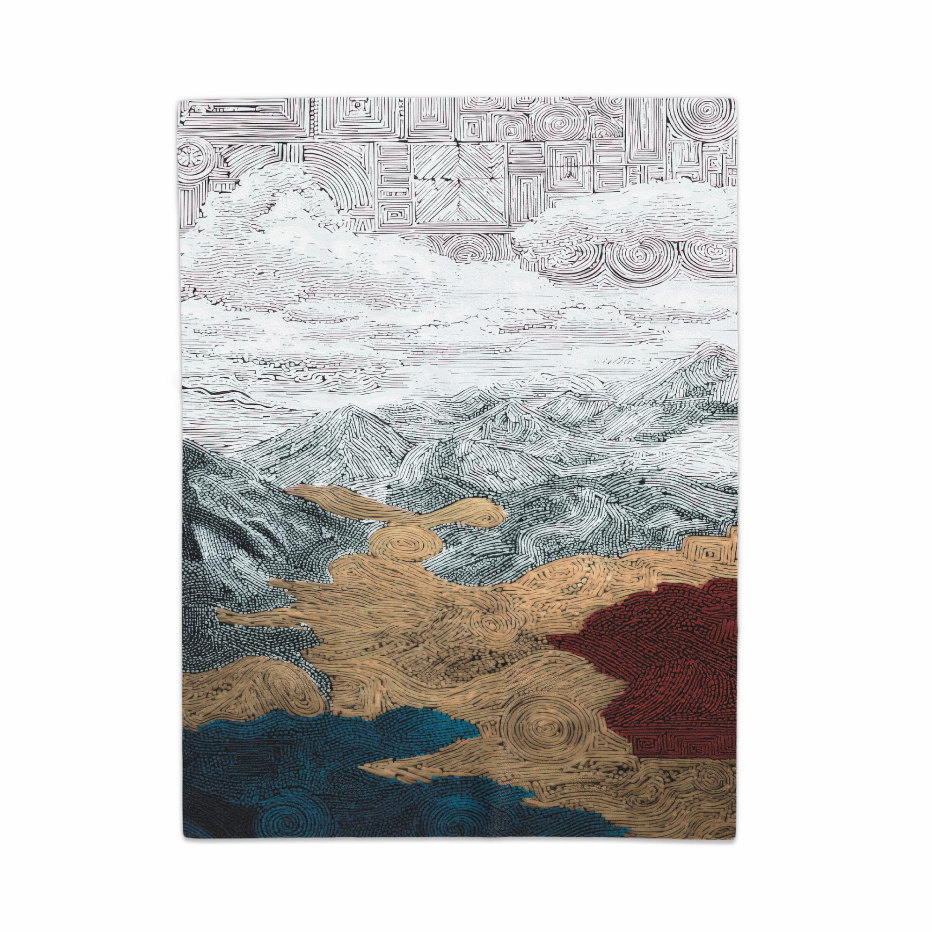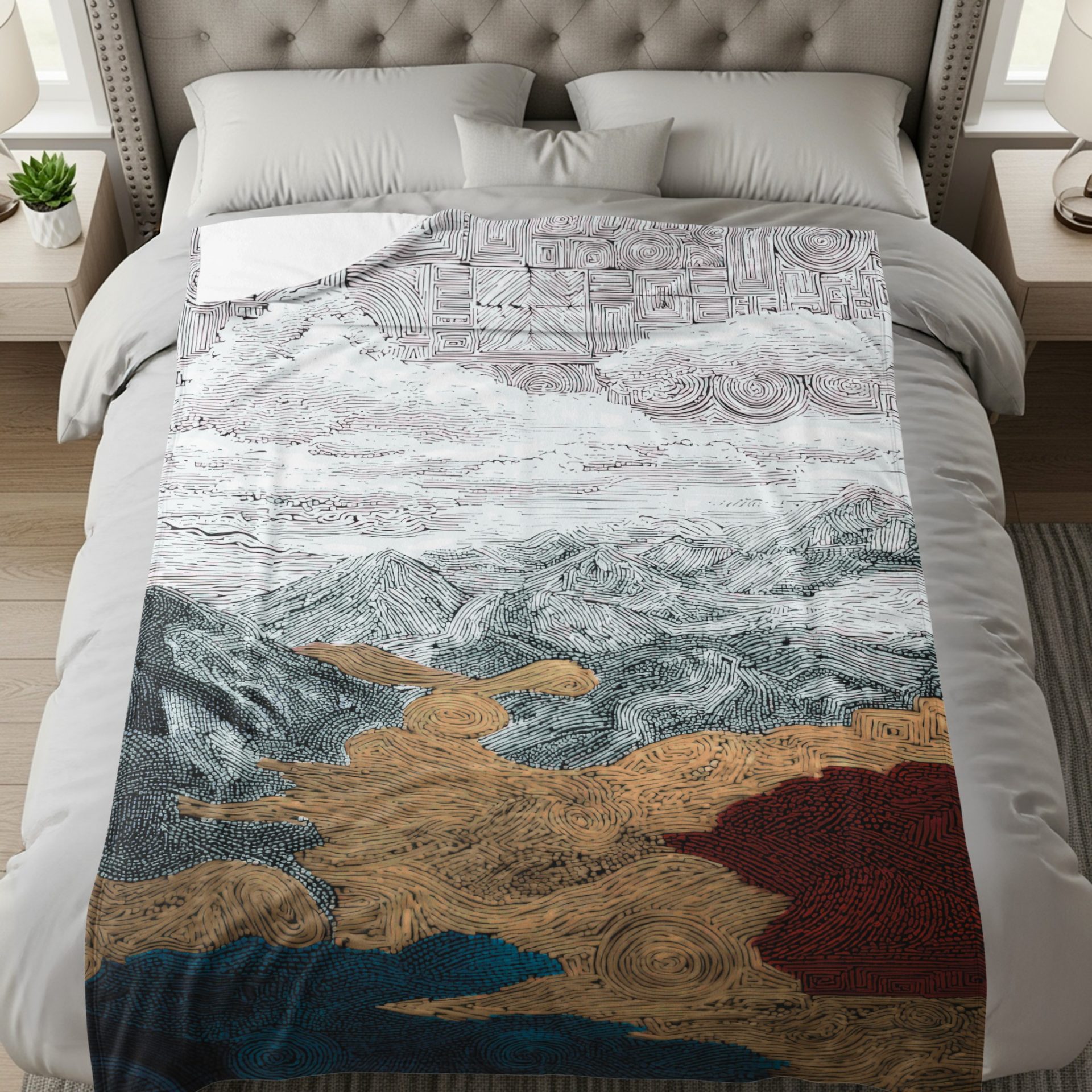 Explore artistic landscape depiction featuring mountains clouds water and geometric patterns. Find the perfect decorative Blankets for your home decor needs here.