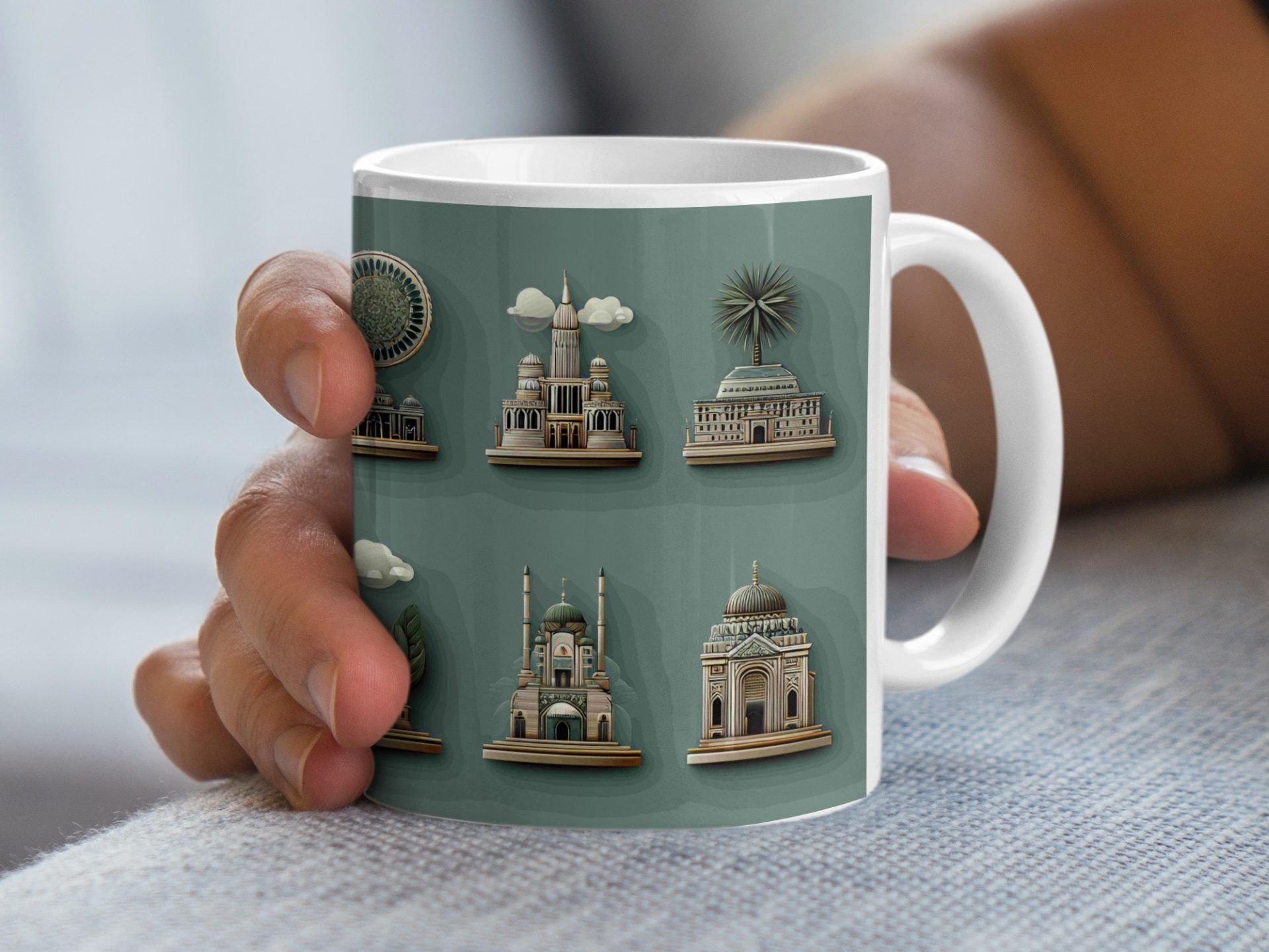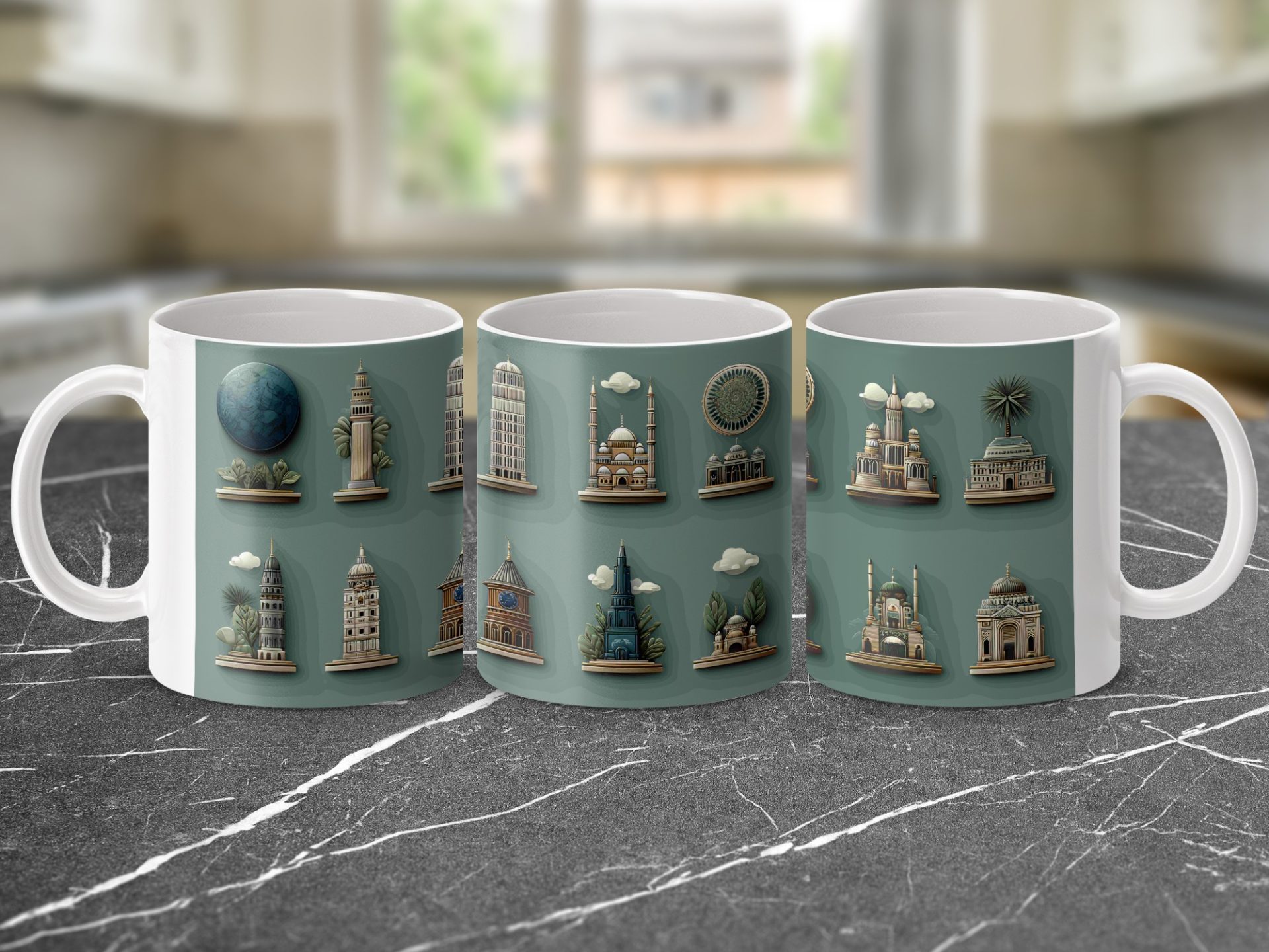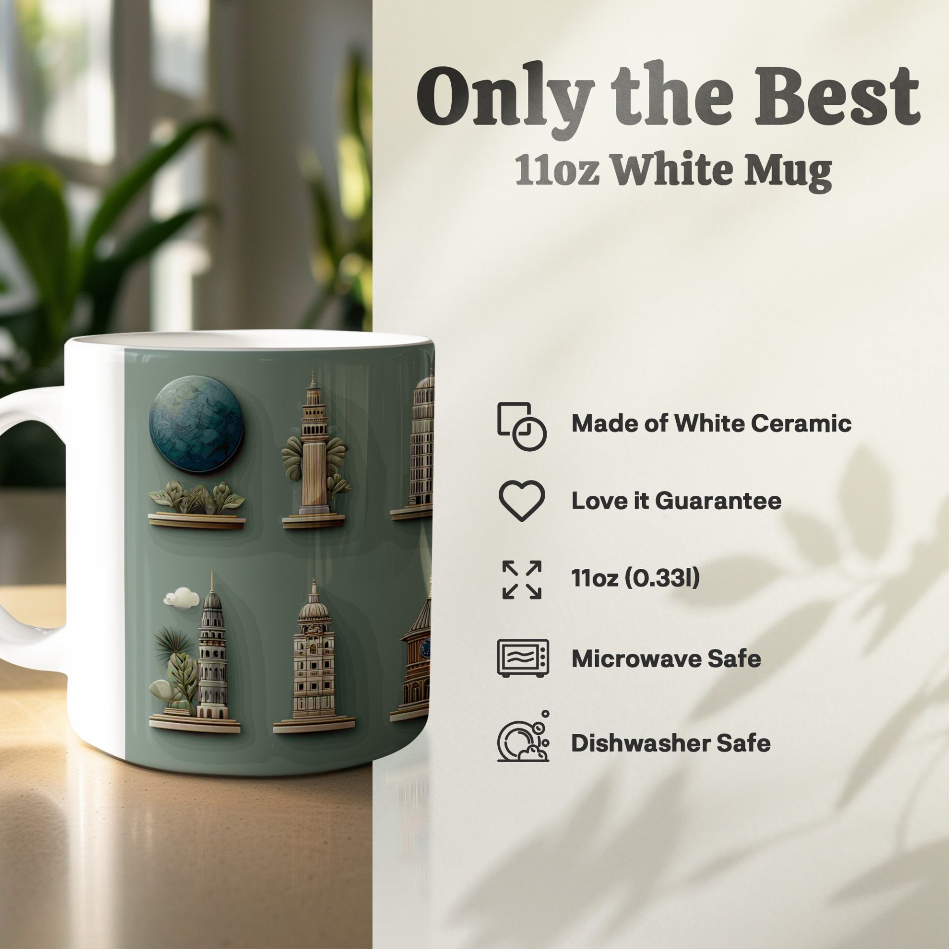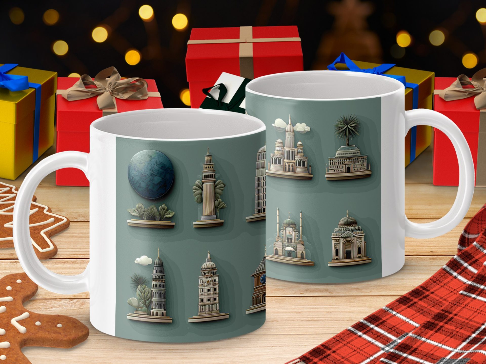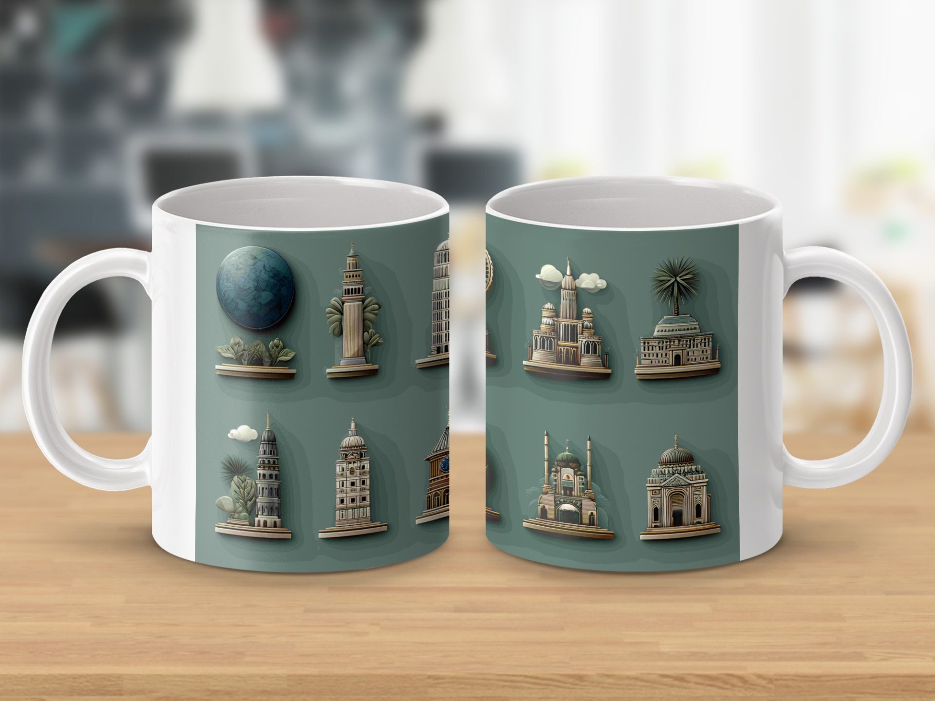 Exquisite Mugs featuring a captivating illustration of various monuments and buildings. The design is set against a stylish blue background. Enjoy your beverage with this unique art.