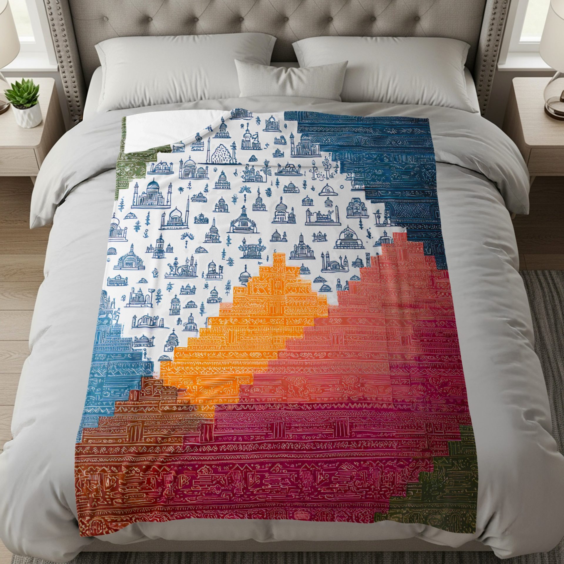 Experience comfort art with our textured blankets featuring a unique monuments illustration pattern. Stylish design warmth perfect to snuggle in with these vibrant blankets.