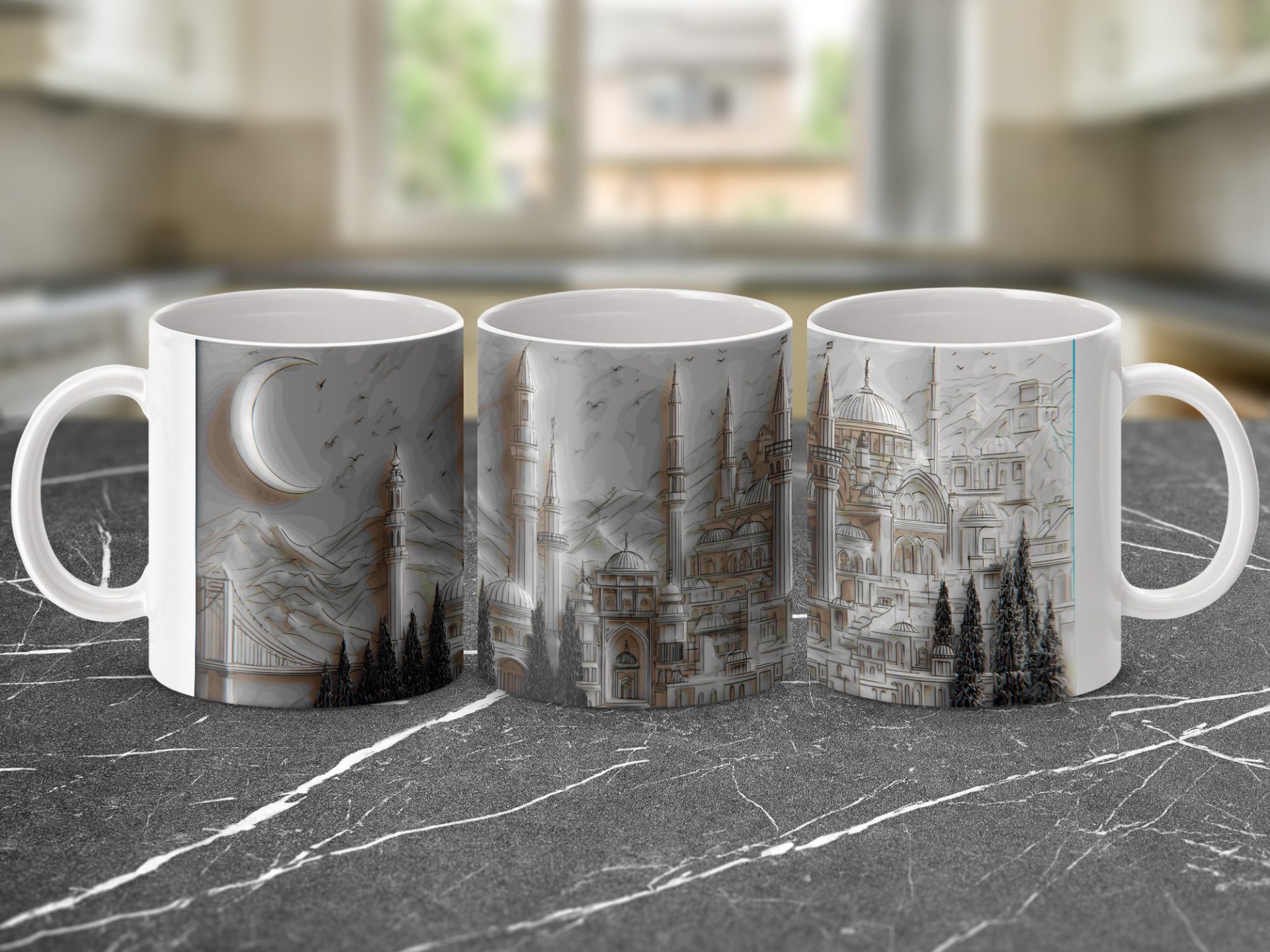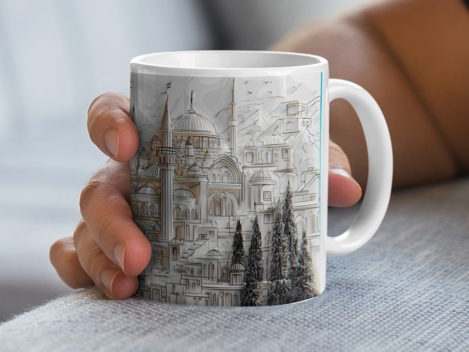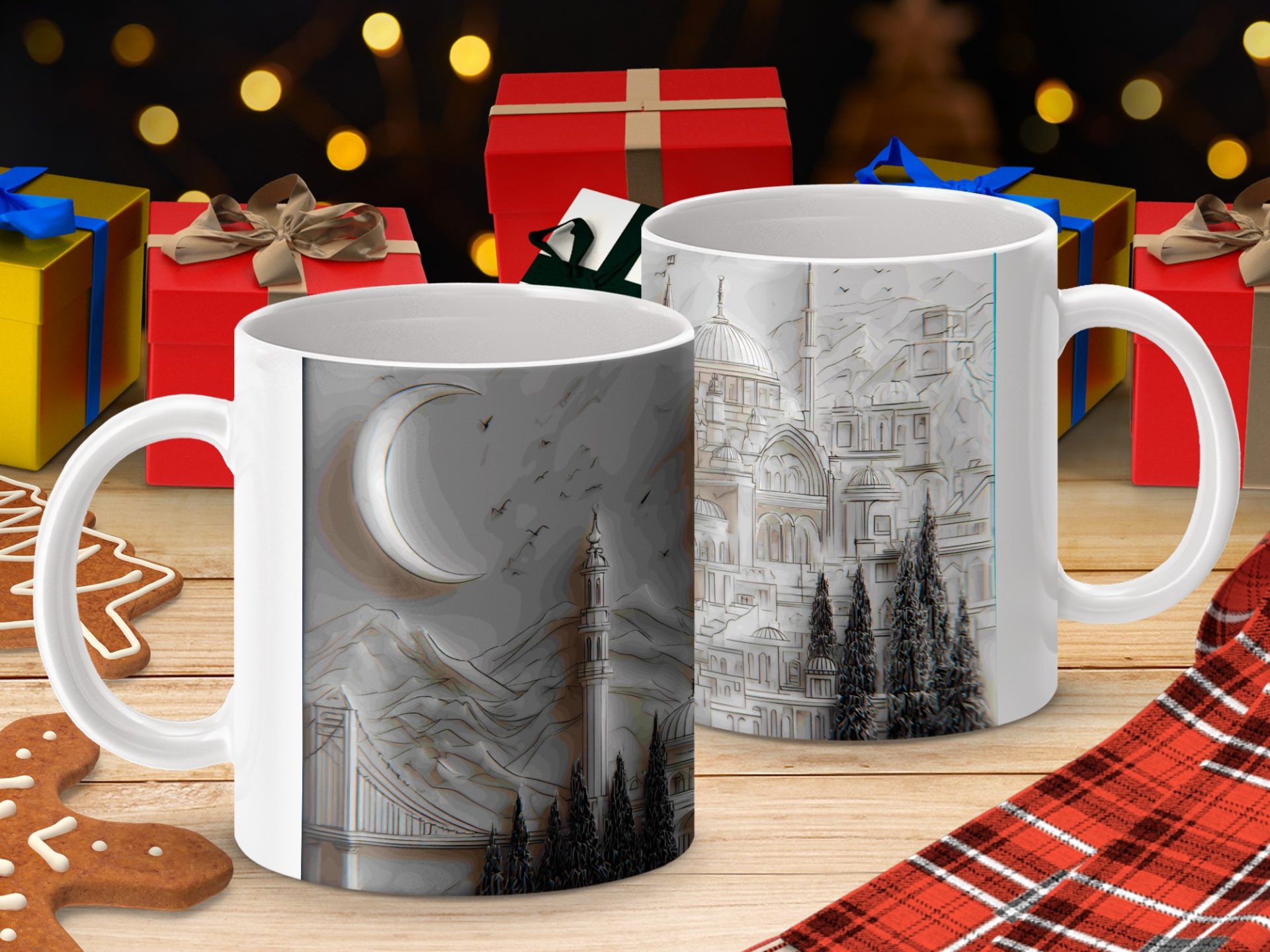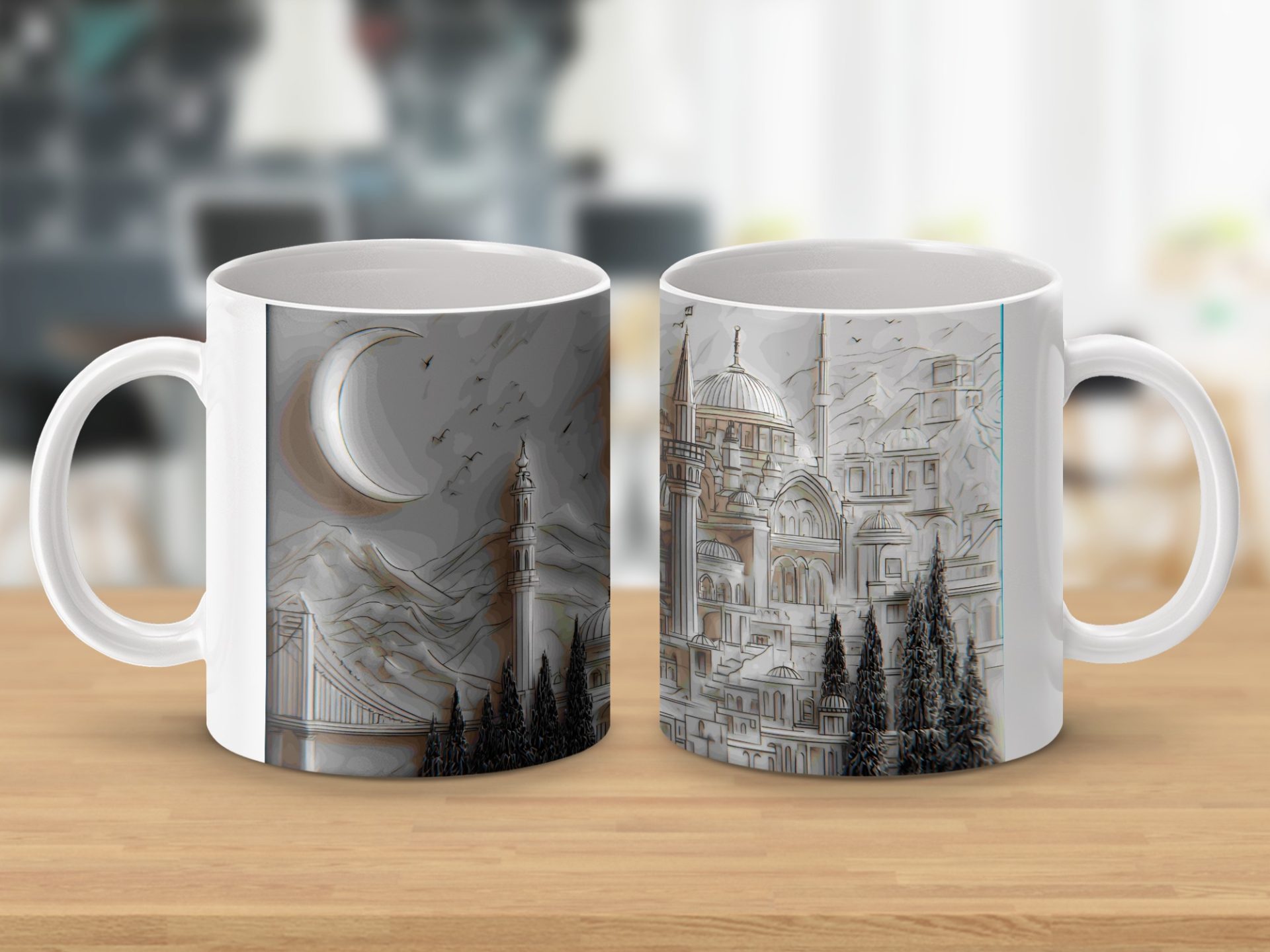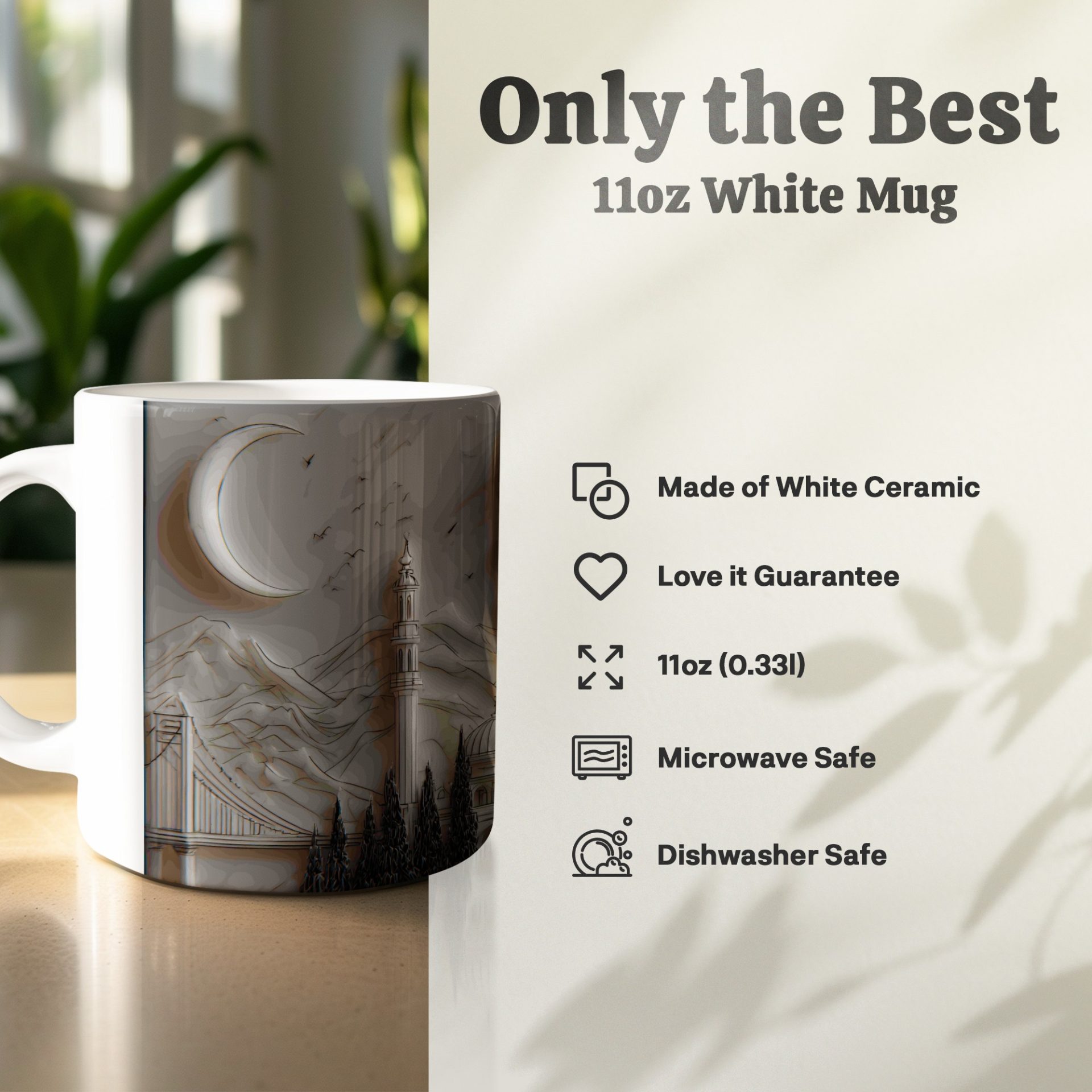Discover this unique mugs featuring a hand-drawn style rendition of an Islamic city under a bright moon with birds above and mountains at the back. Perfect gift for art lovers.