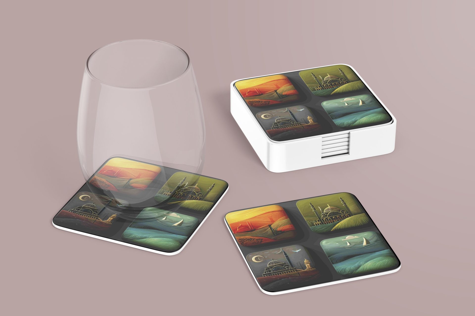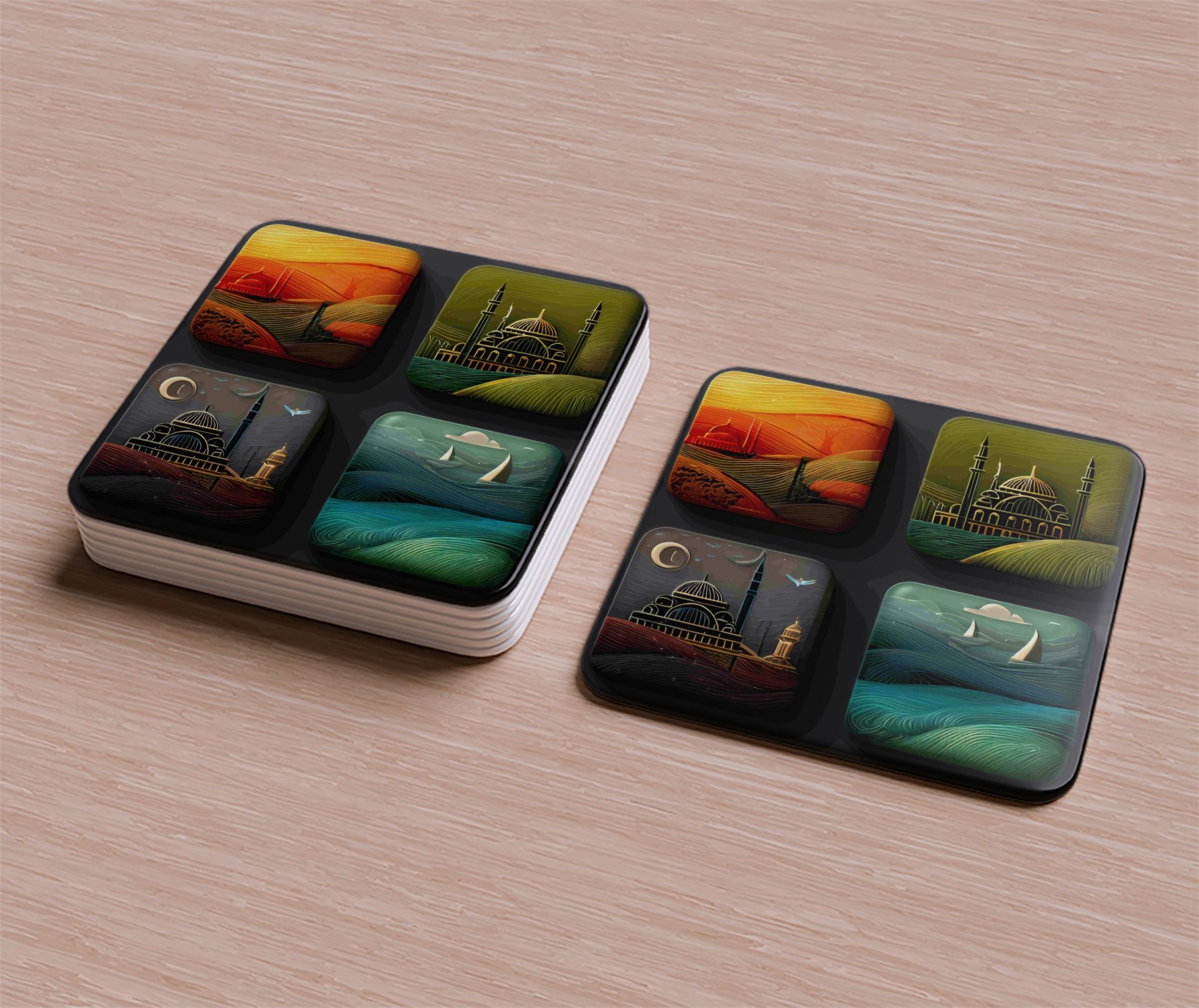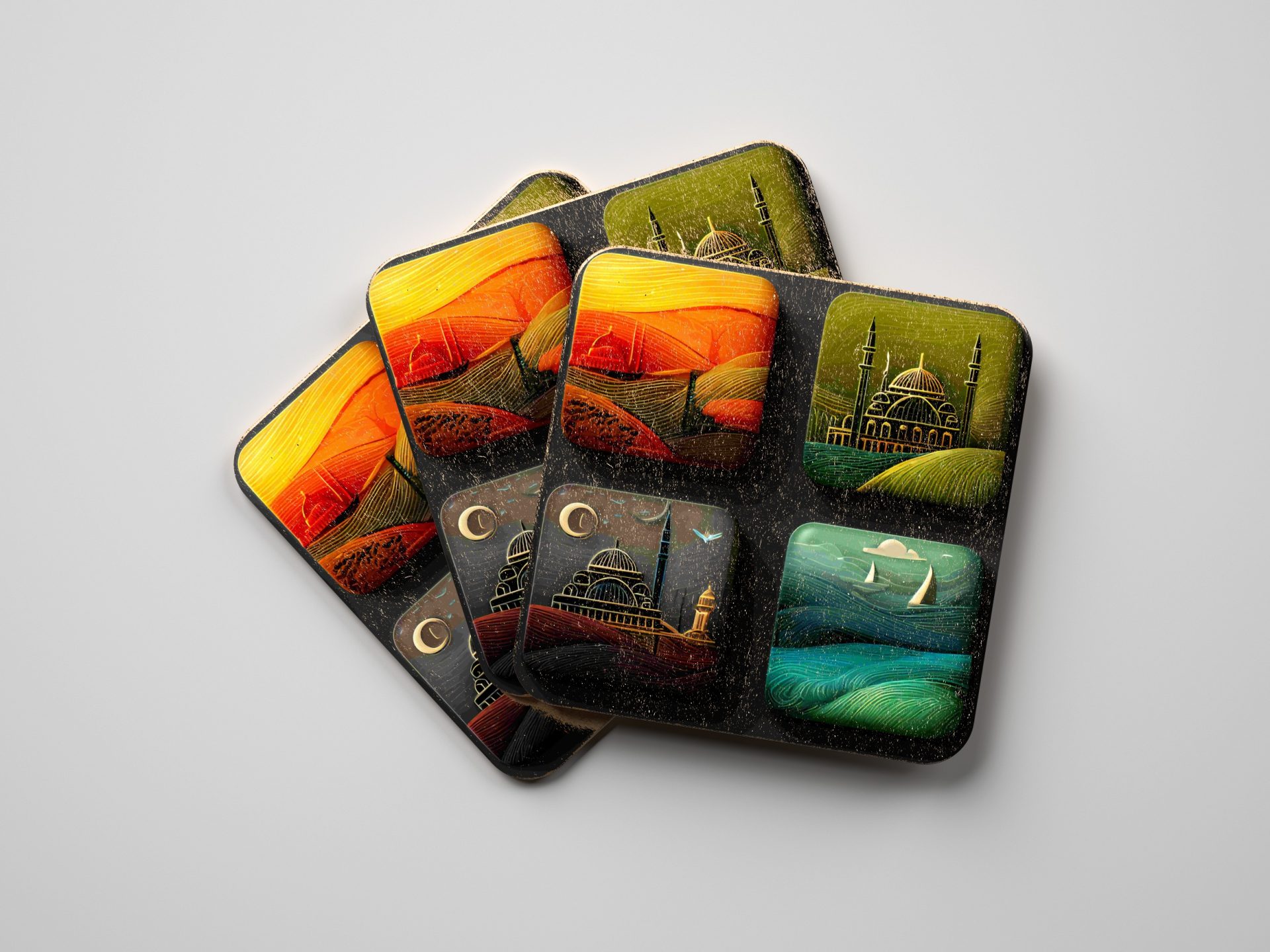 Elevate your home decor with these stunning coasters! Featuring unique mosque and sailing ship inspired designs in vibrant colors. Protect surfaces with style using this art.