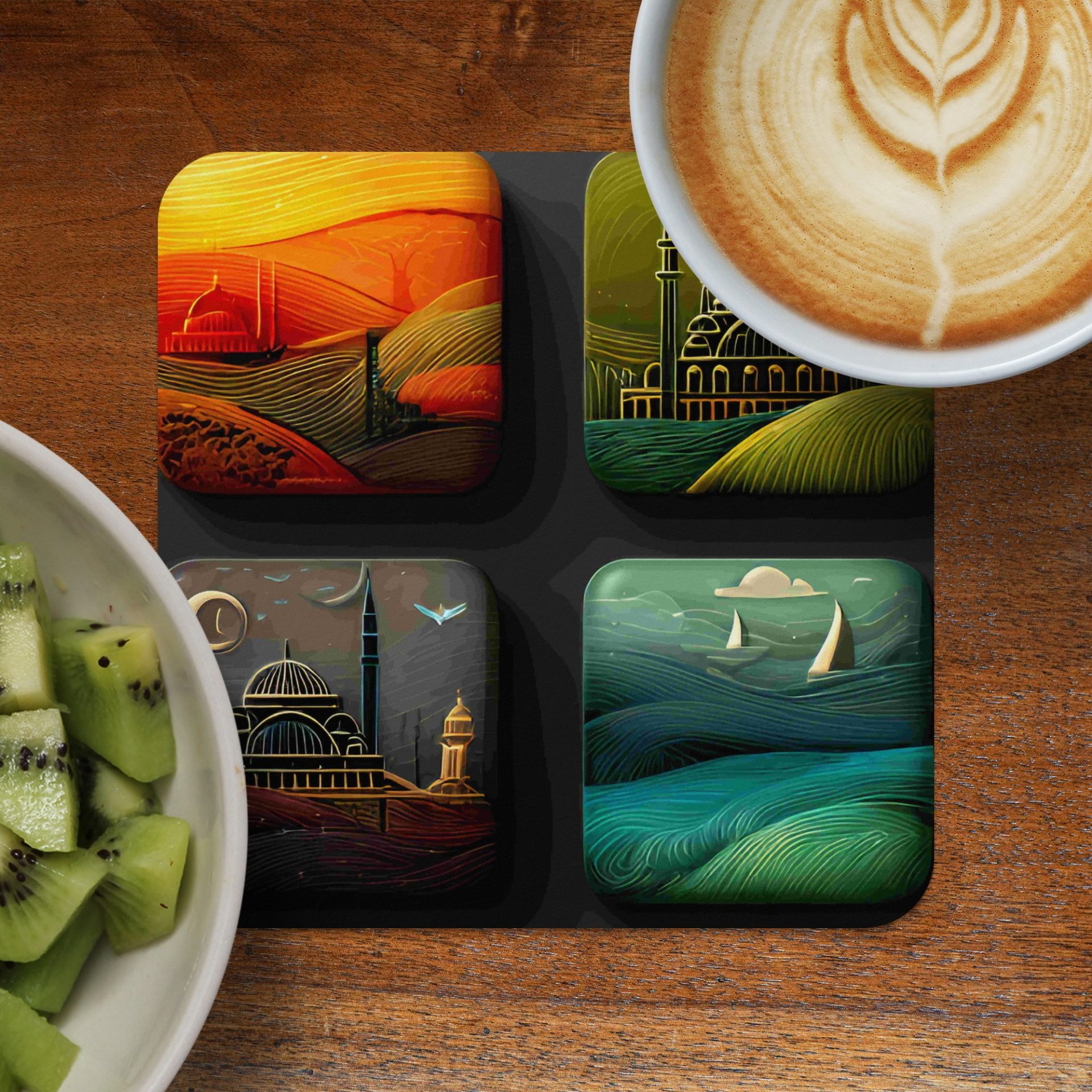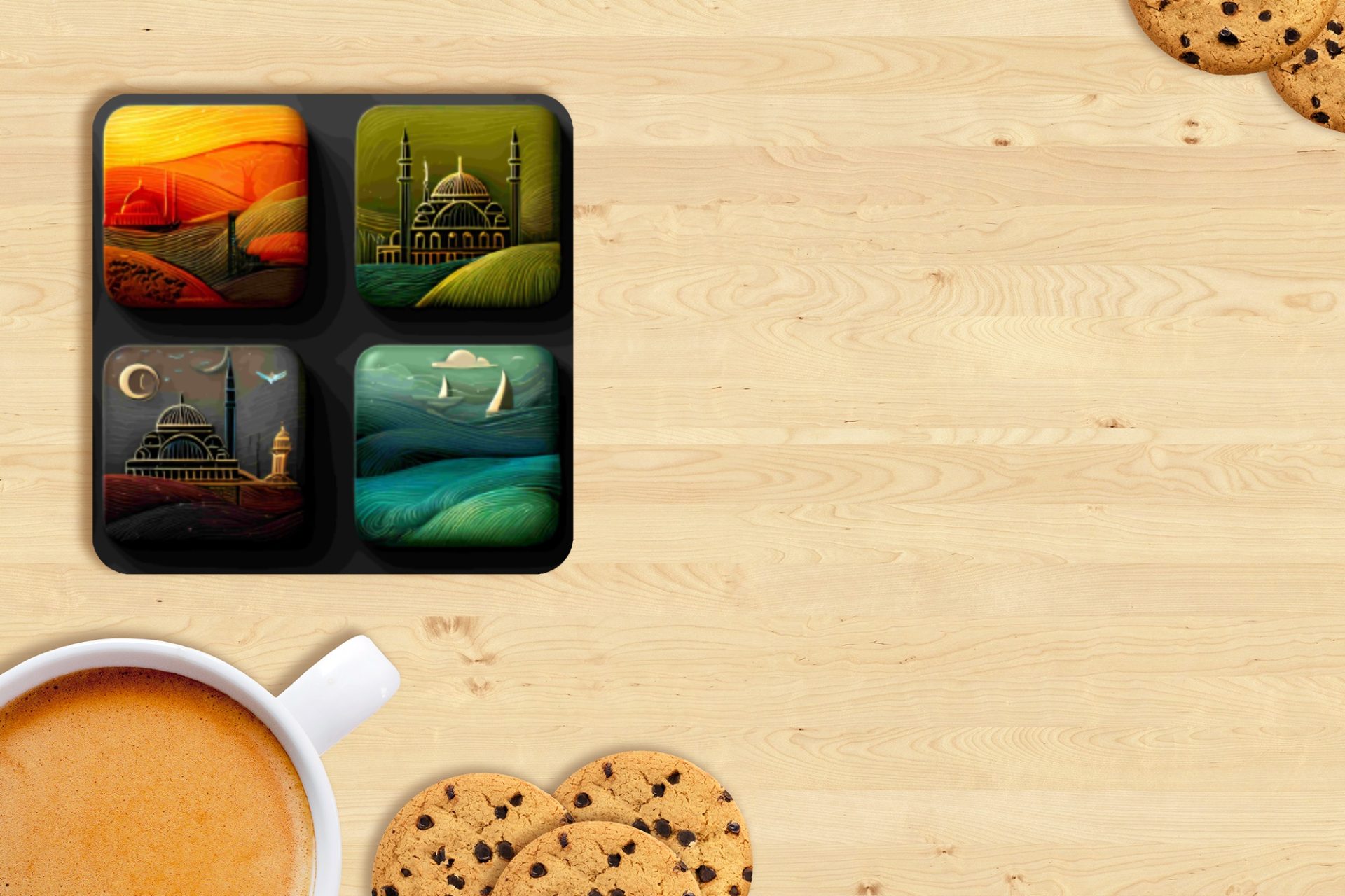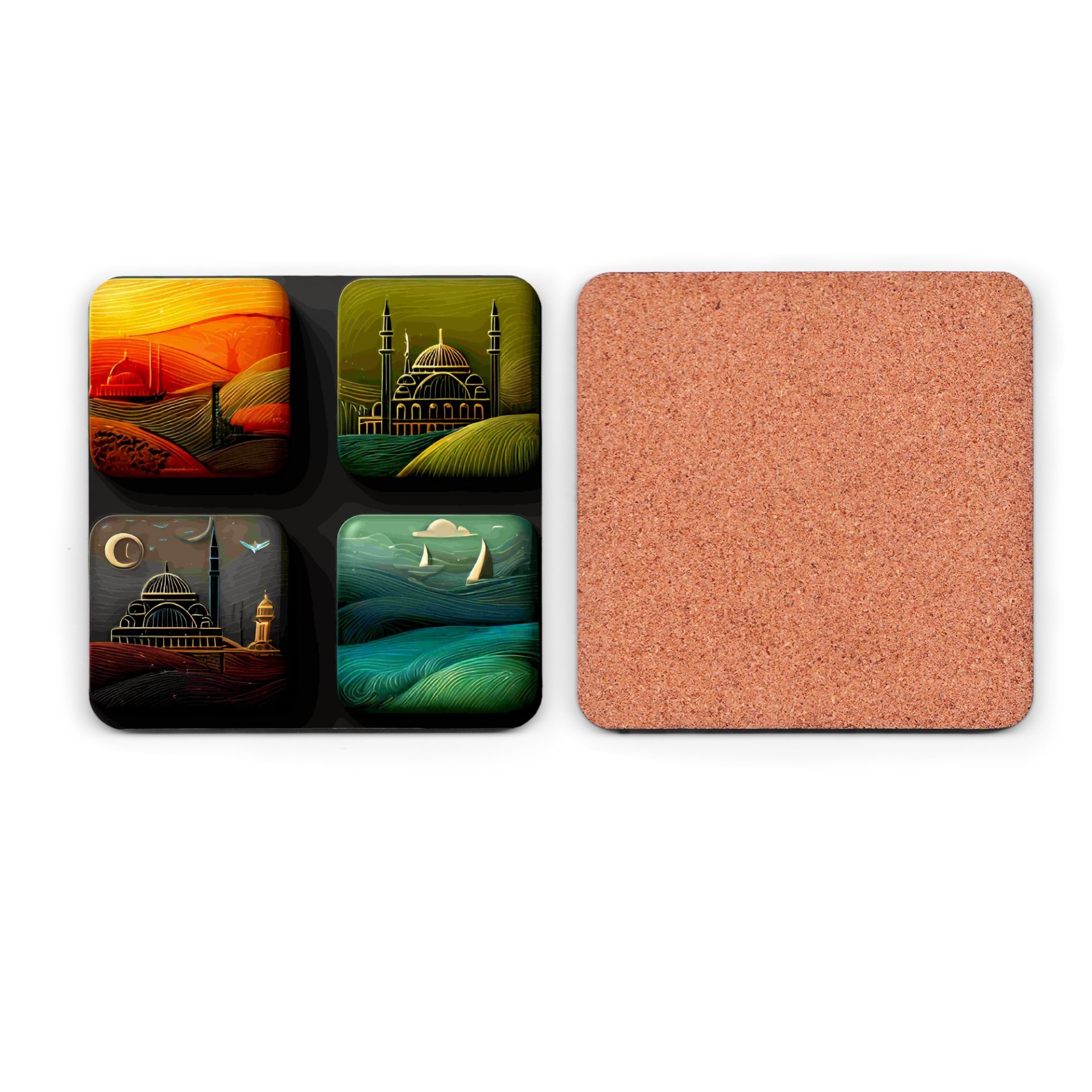 Elevate your home decor with these stunning coasters! Featuring unique mosque and sailing ship inspired designs in vibrant colors. Protect surfaces with style using this art.