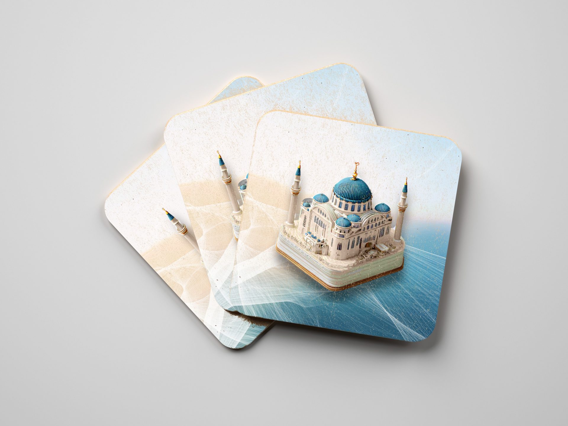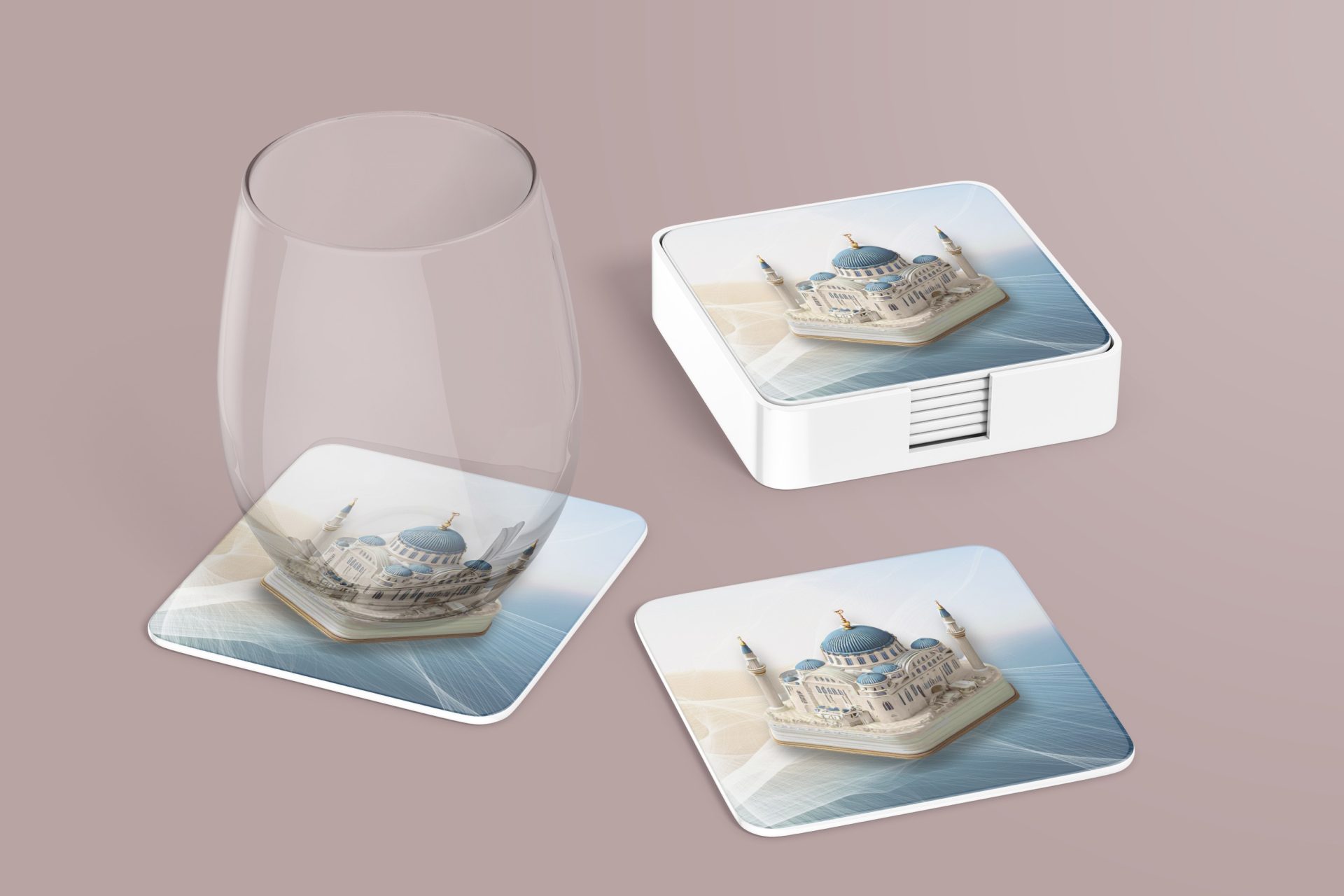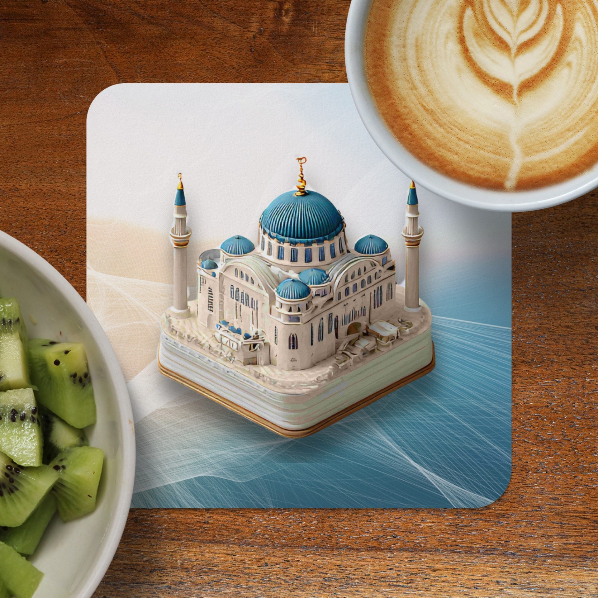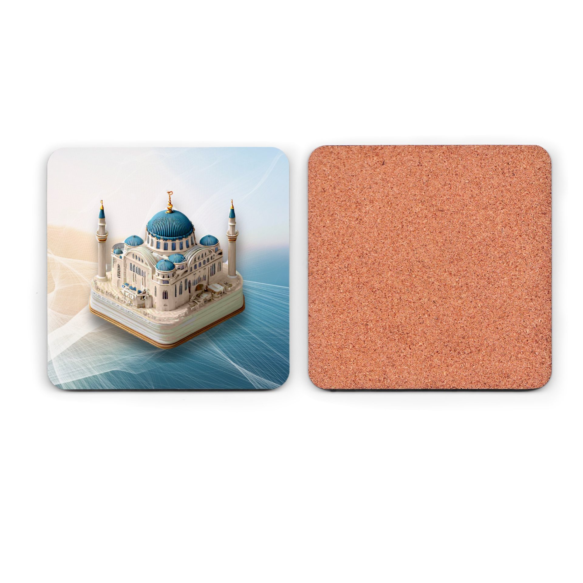 Add a unique touch to your space with these beautiful mosque architectural coasters featuring a blue dome and minarets. Enhance decor with an element of architecture.