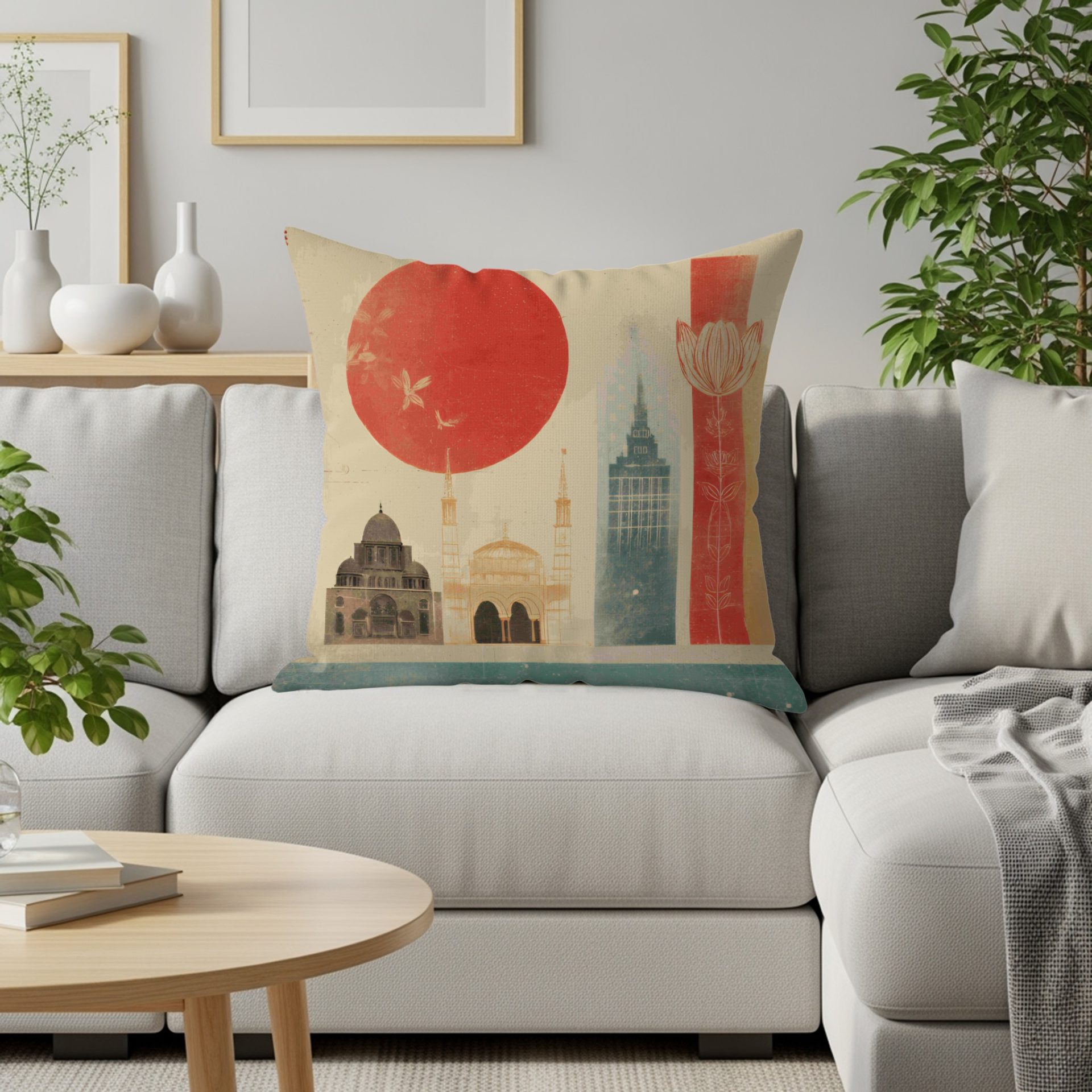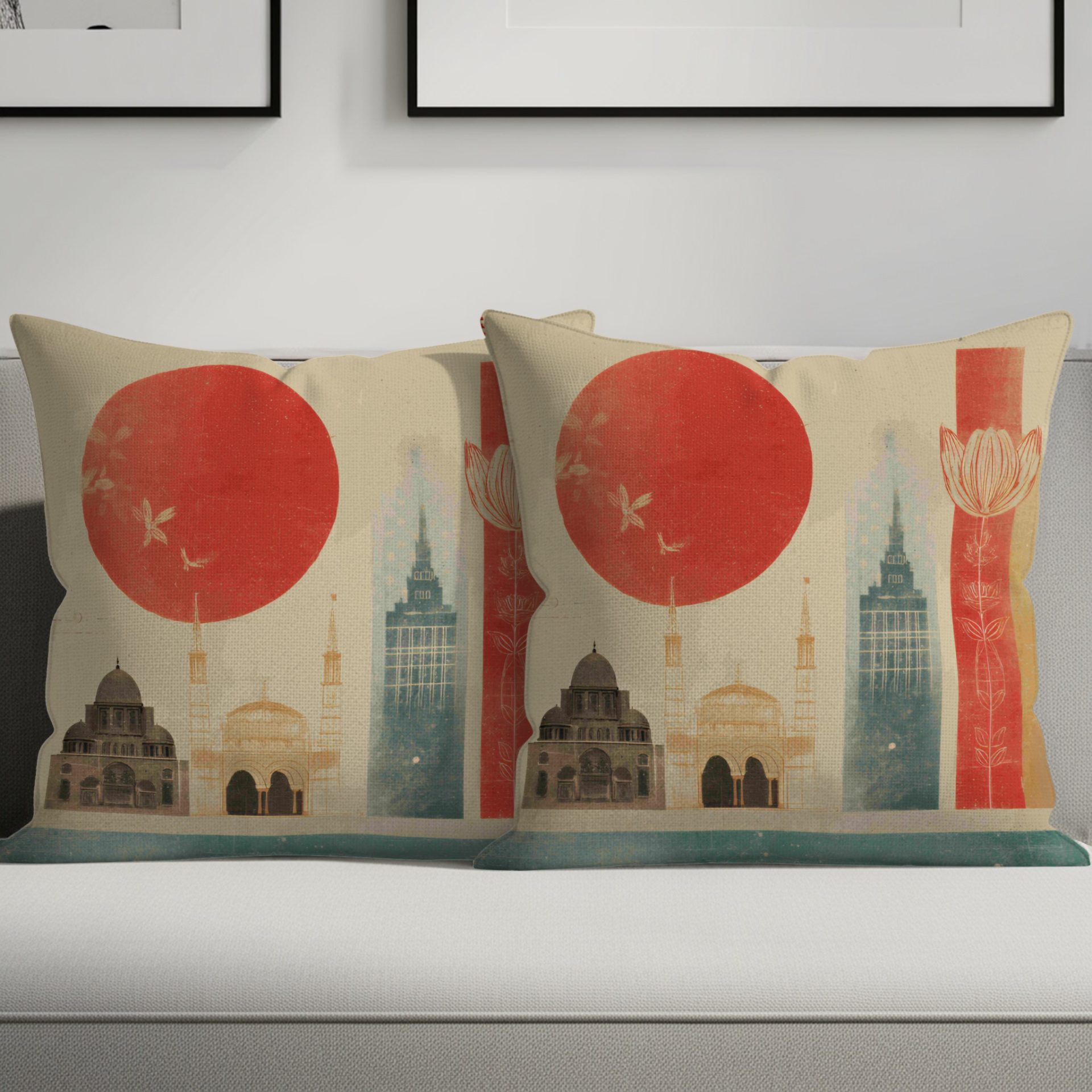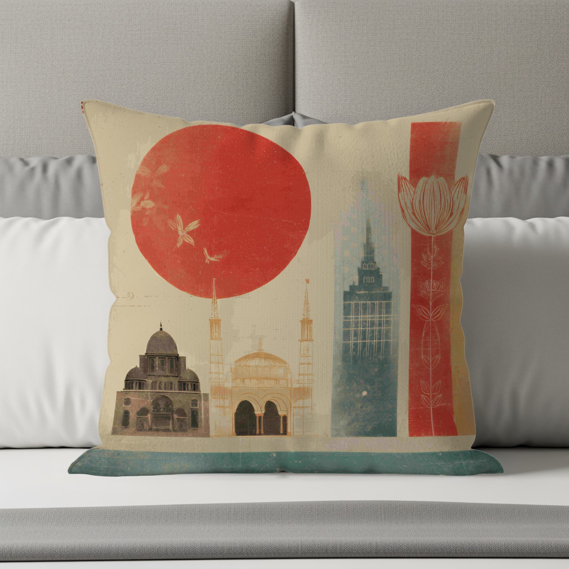 Transform your space with our decorative pillow covers featuring an oriental landscape design with geometric shapes. Ideal for adding an artistic touch to your home decor.