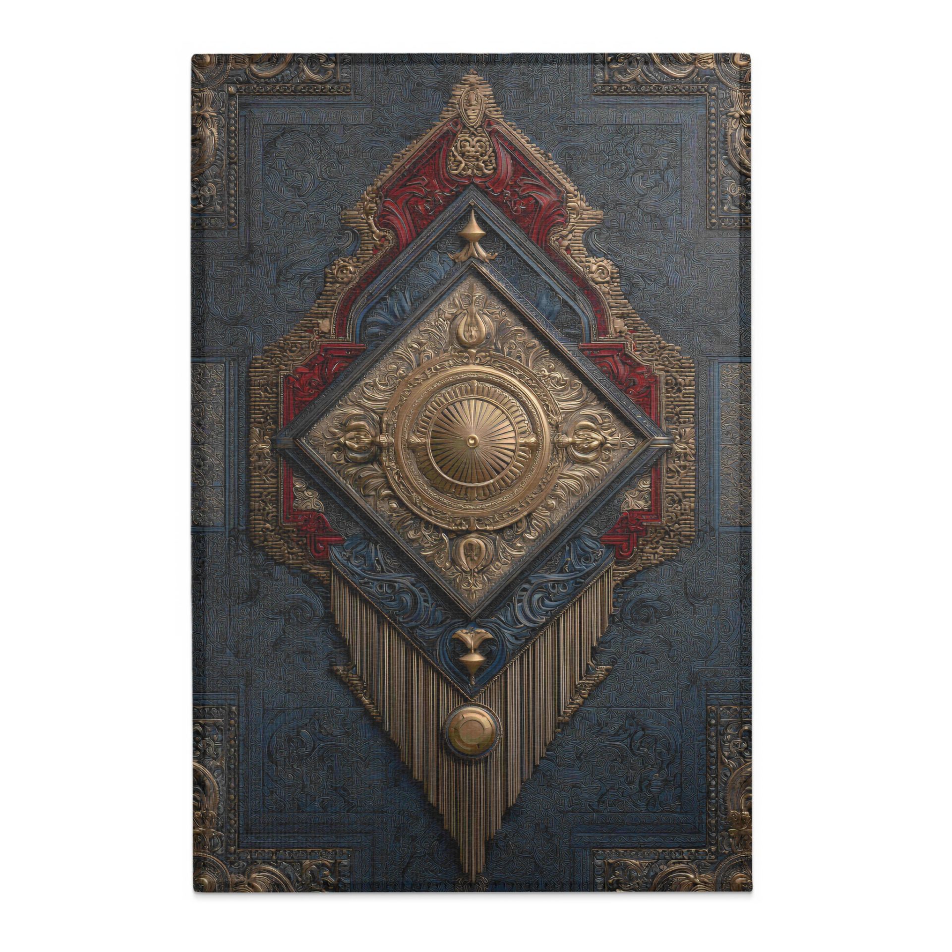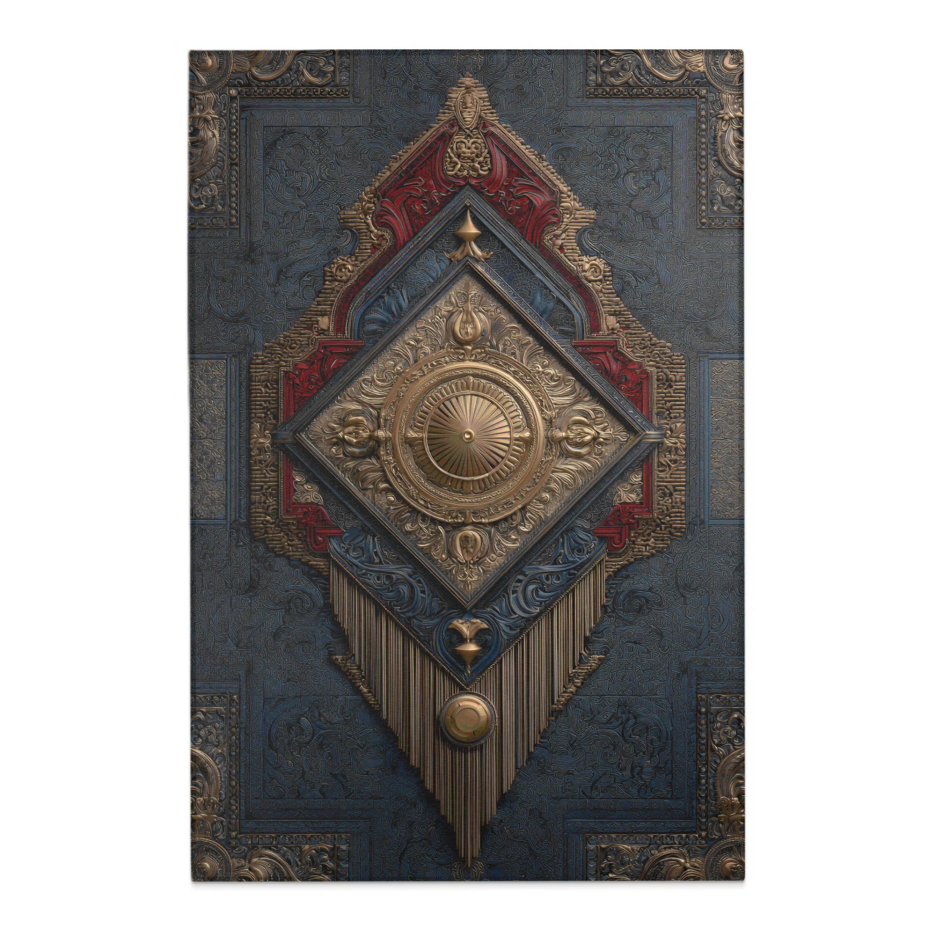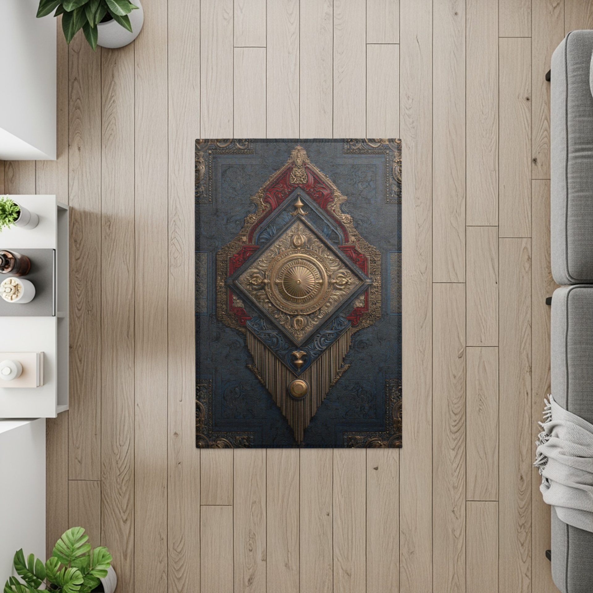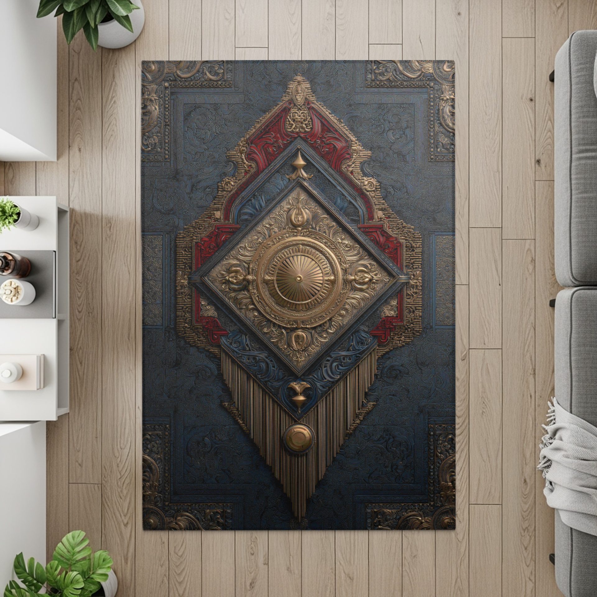 Elevate your home decor with this rug. Featuring intricate gold details on a textured background with accents of red this rug can add a touch of elegance and artistry to any space.