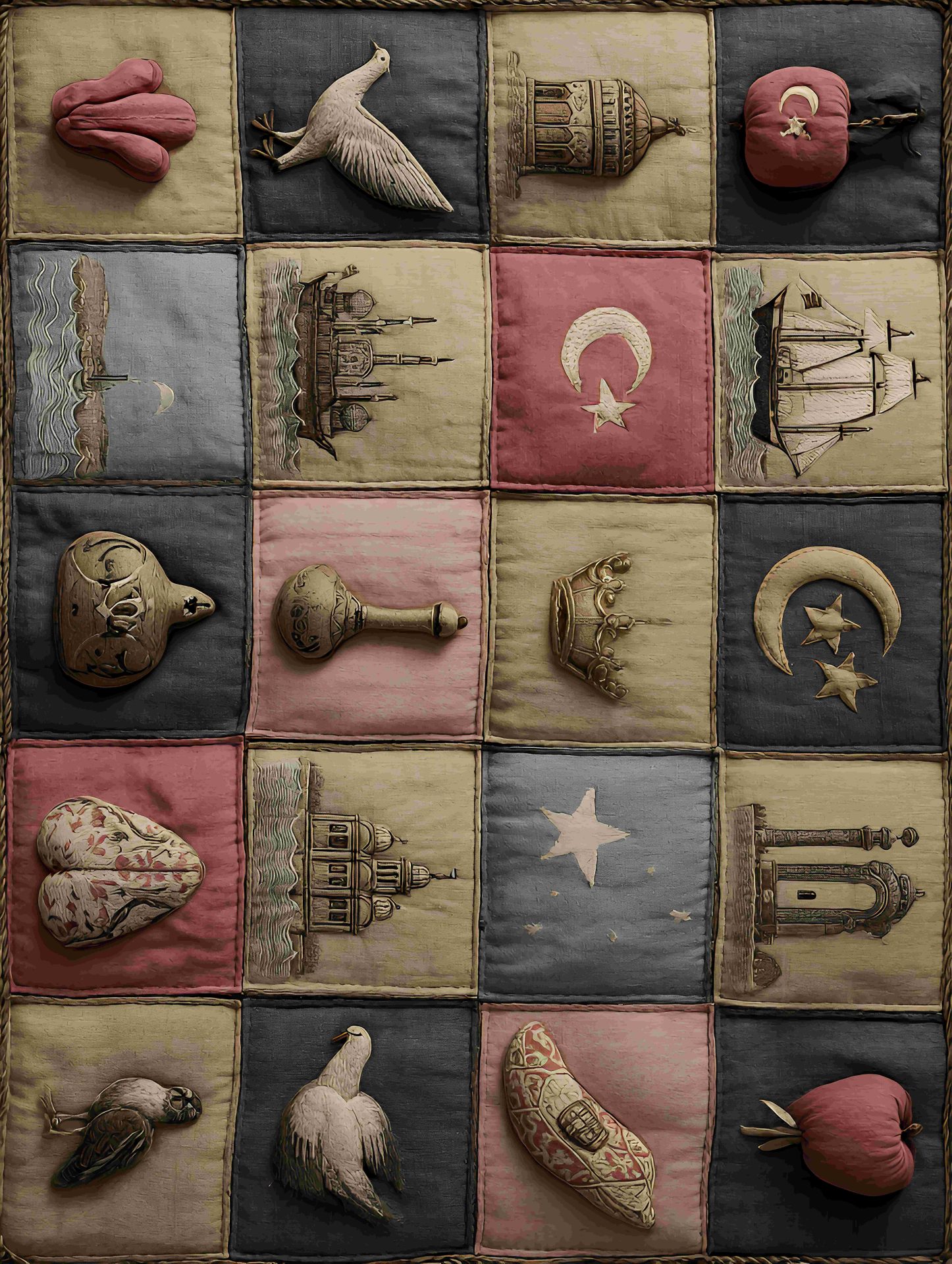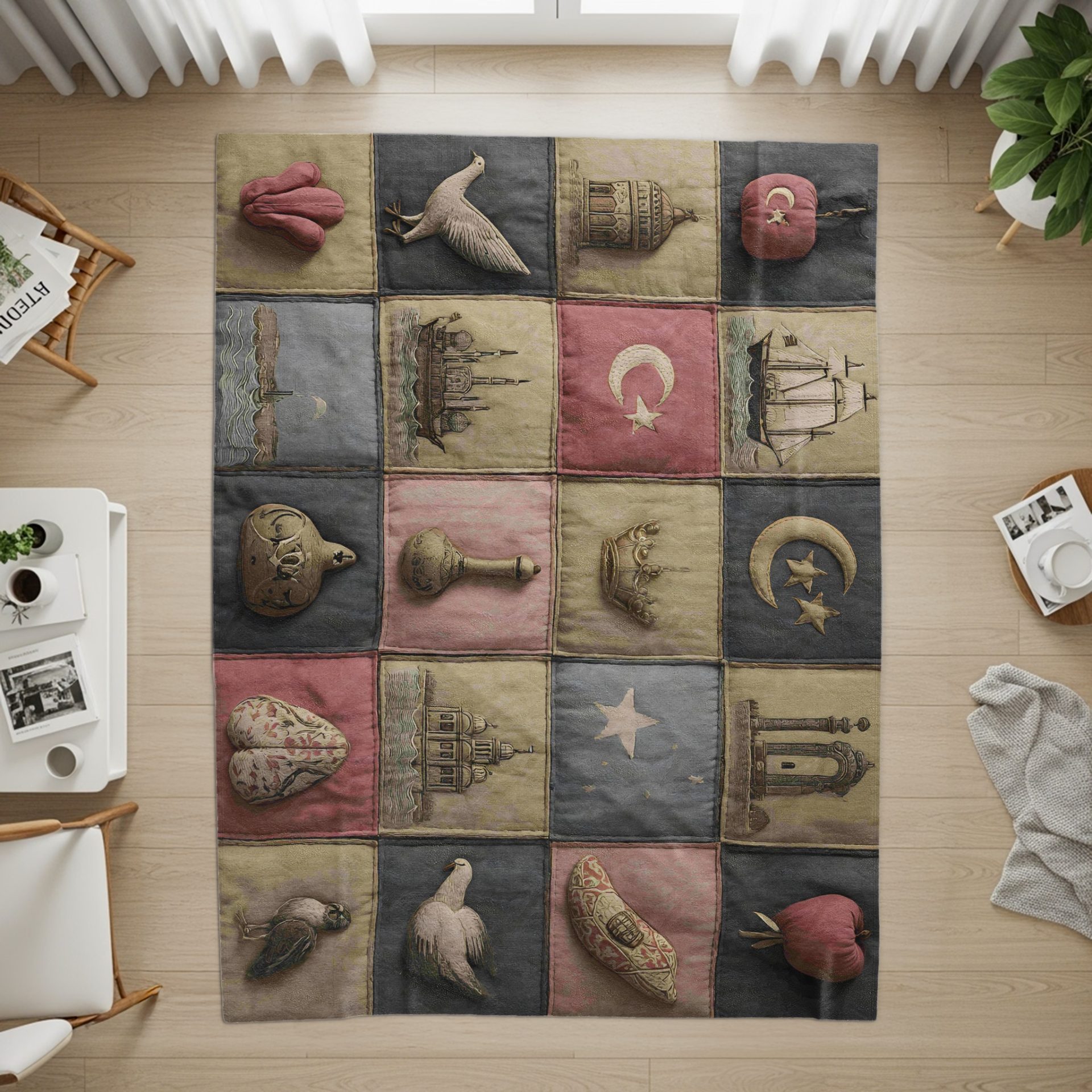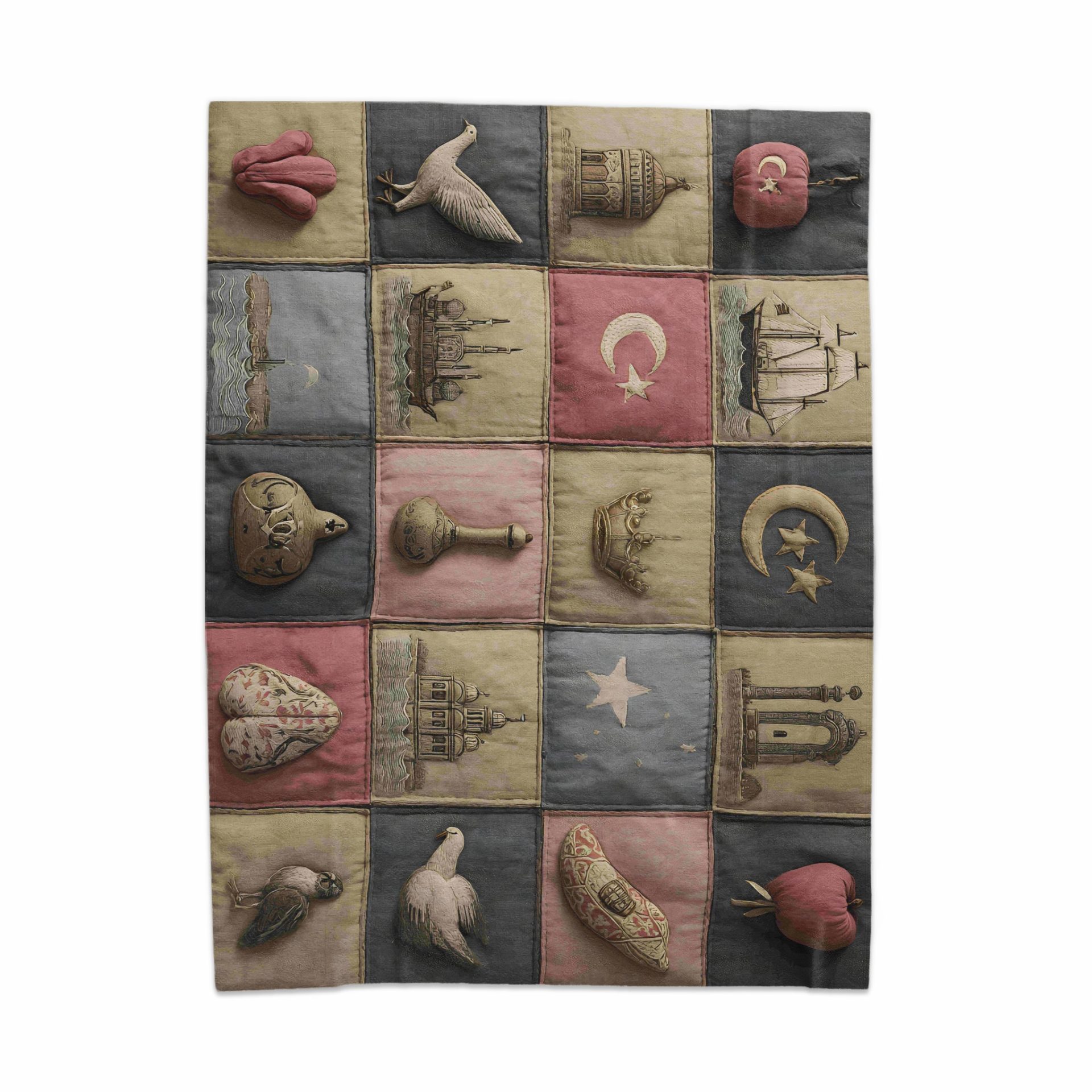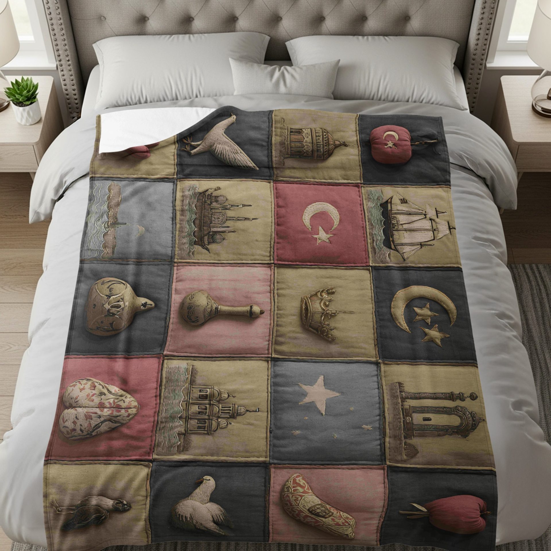 Immerse in historical Ottoman Empire beauty with our patchwork Blankets. Detailed imagery artfully blending Turkish flags historic architecture for warm aesthetic appeal.