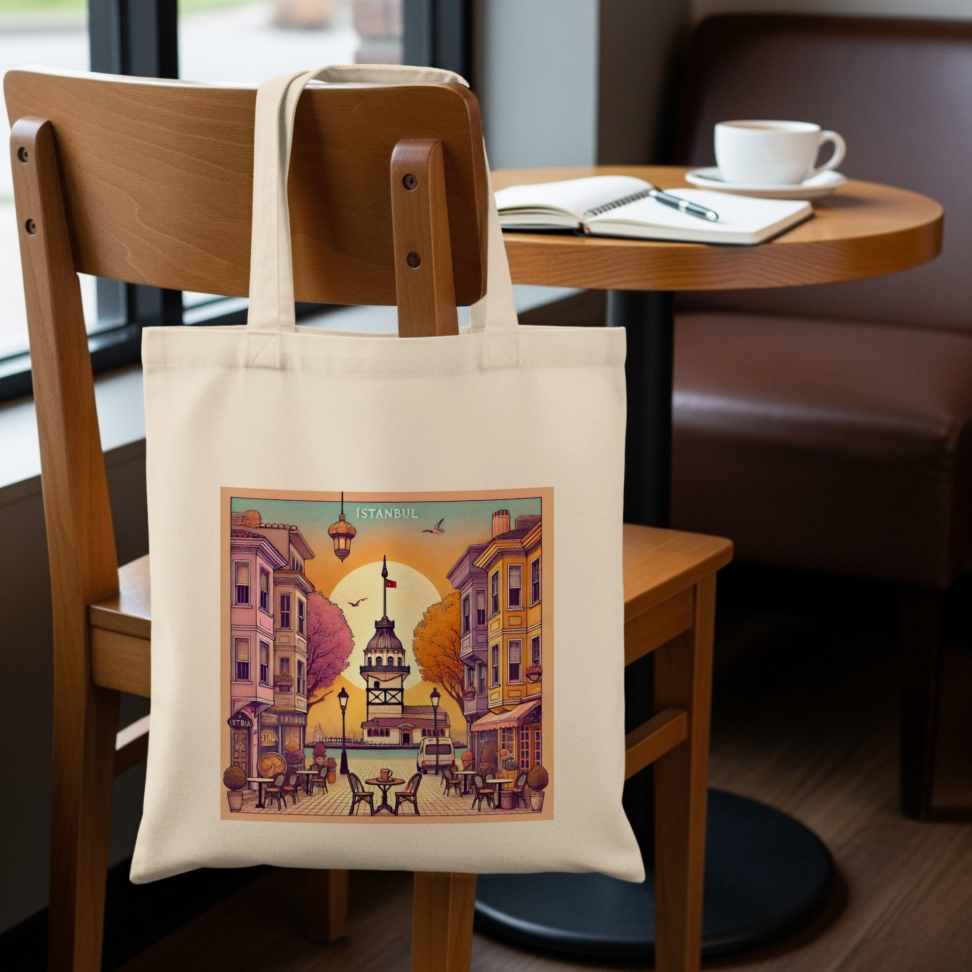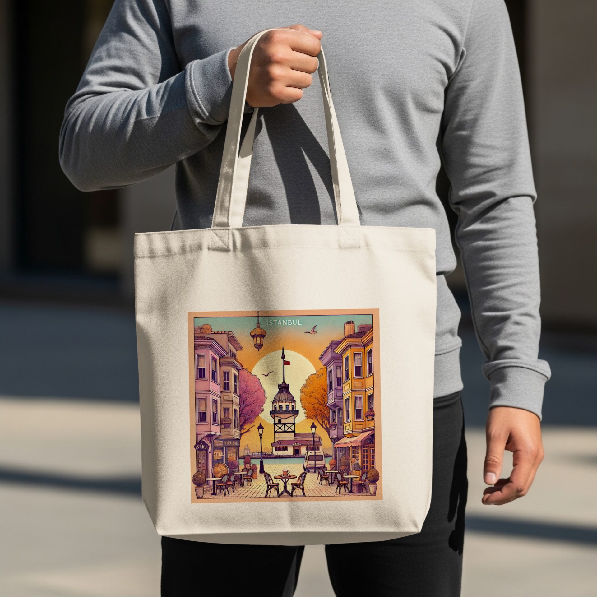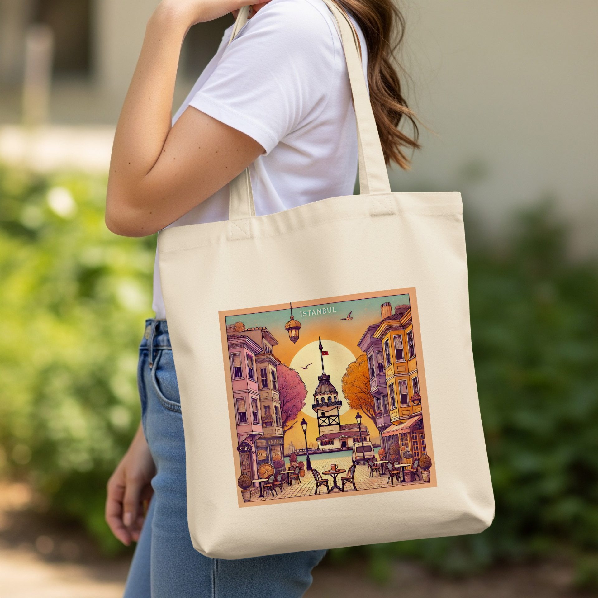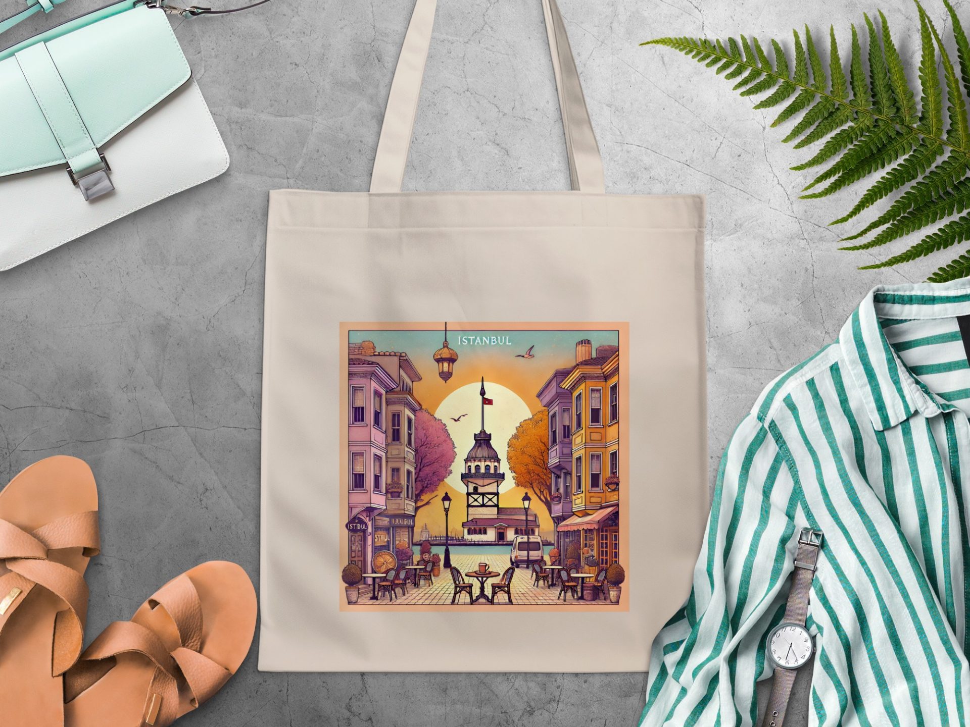 Explore the beauty of Istanbul with this stunning cityscape design. Featuring iconic architecture and vibrant colors this tote bag is perfect for travel lovers.
