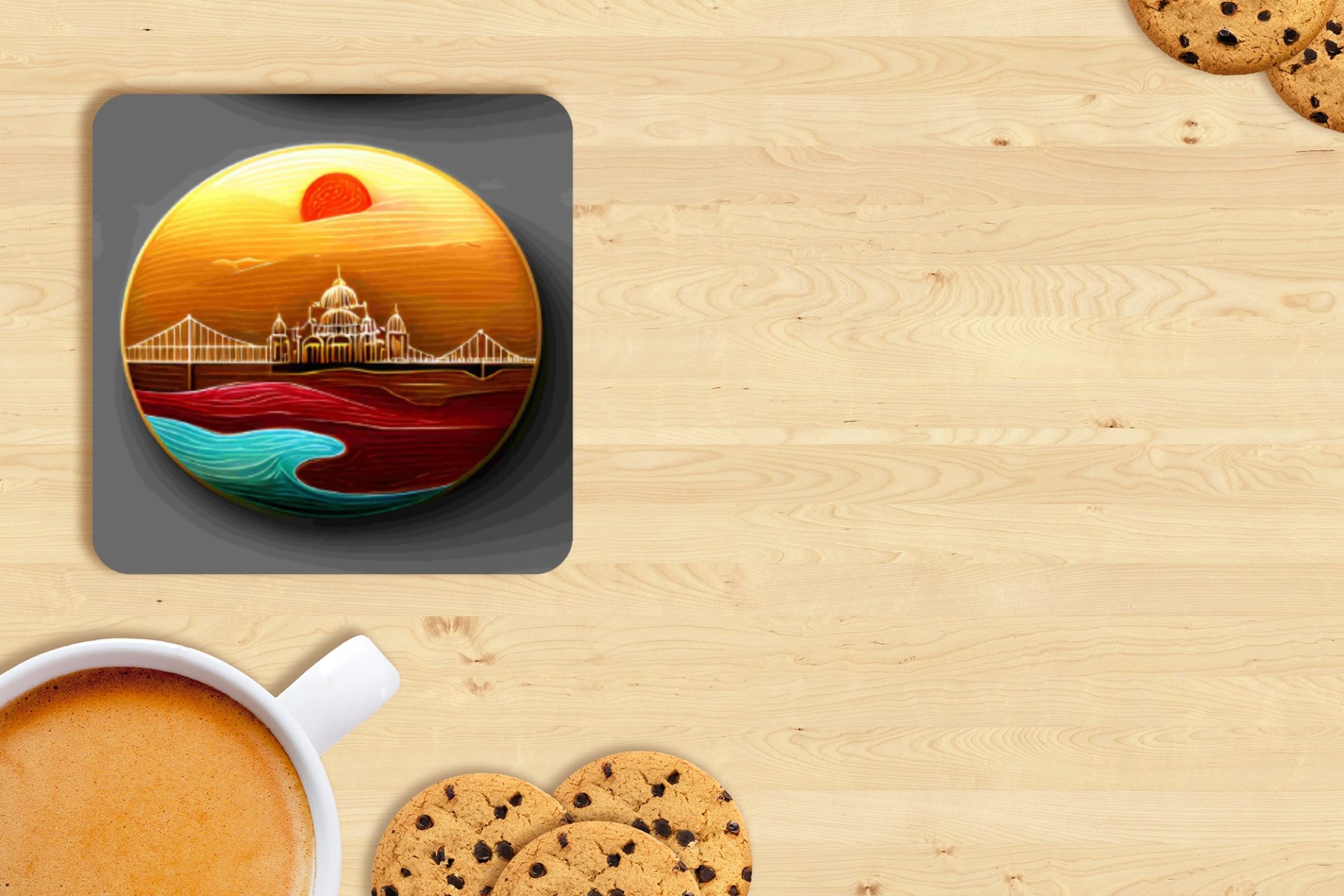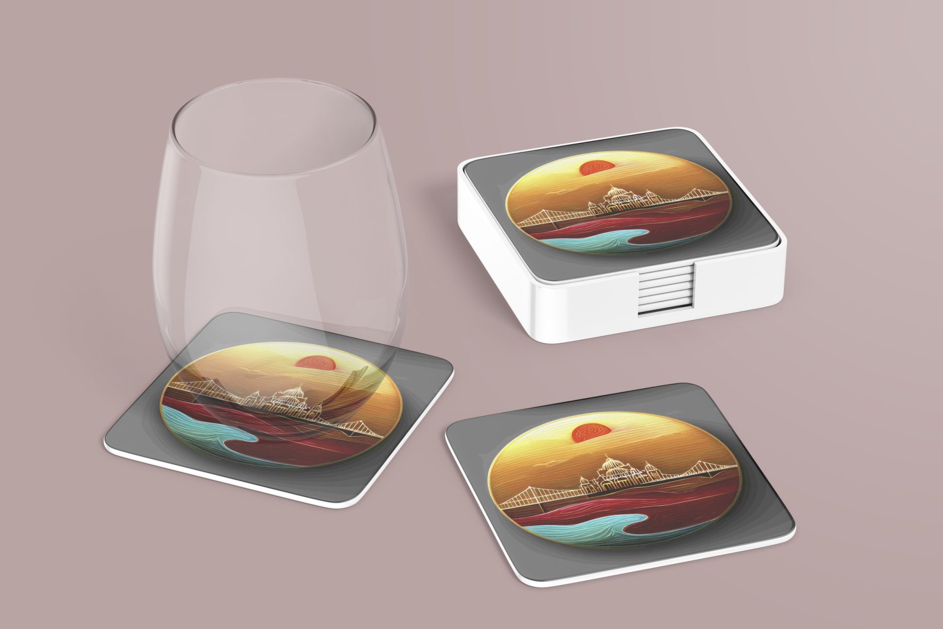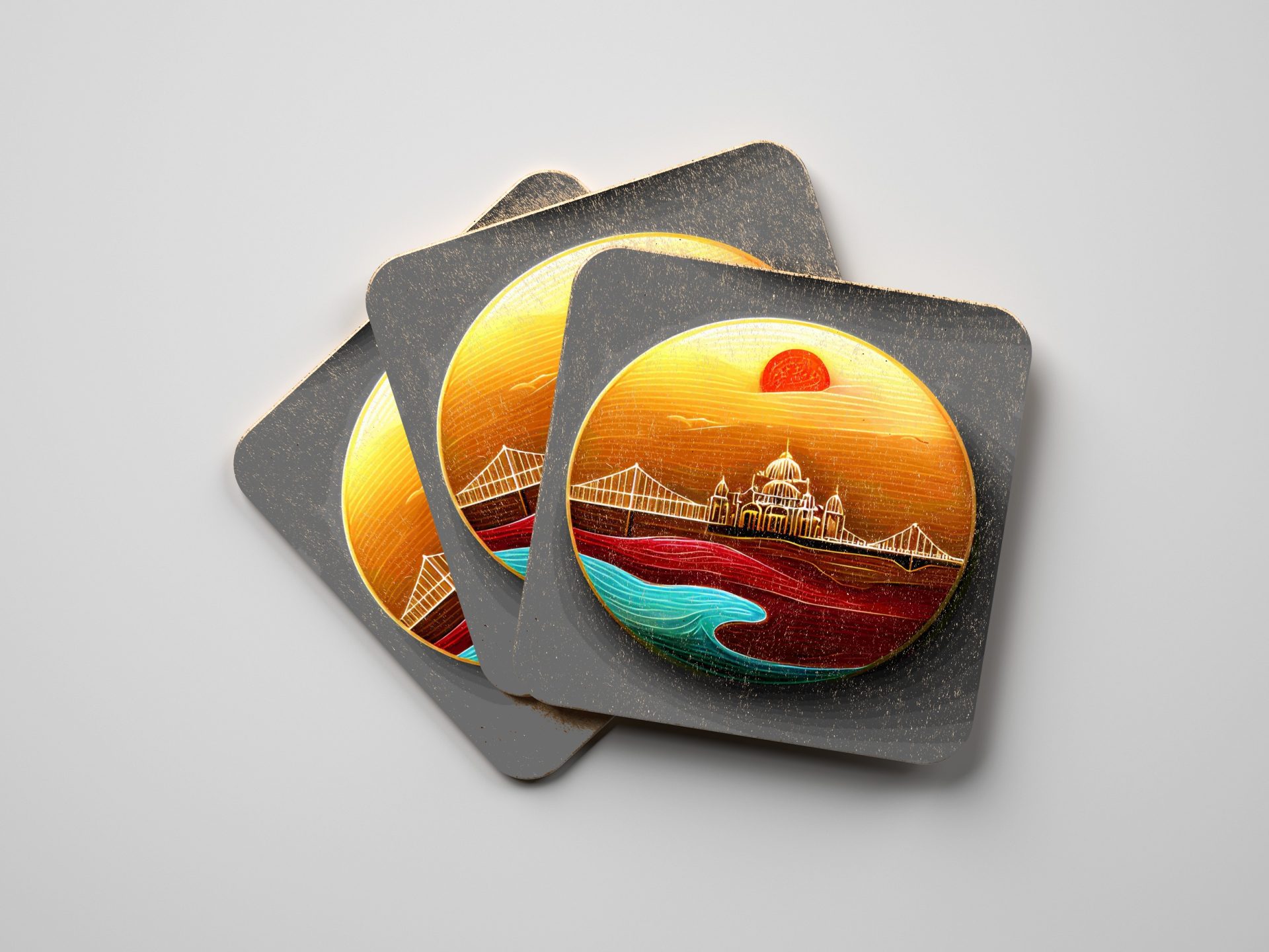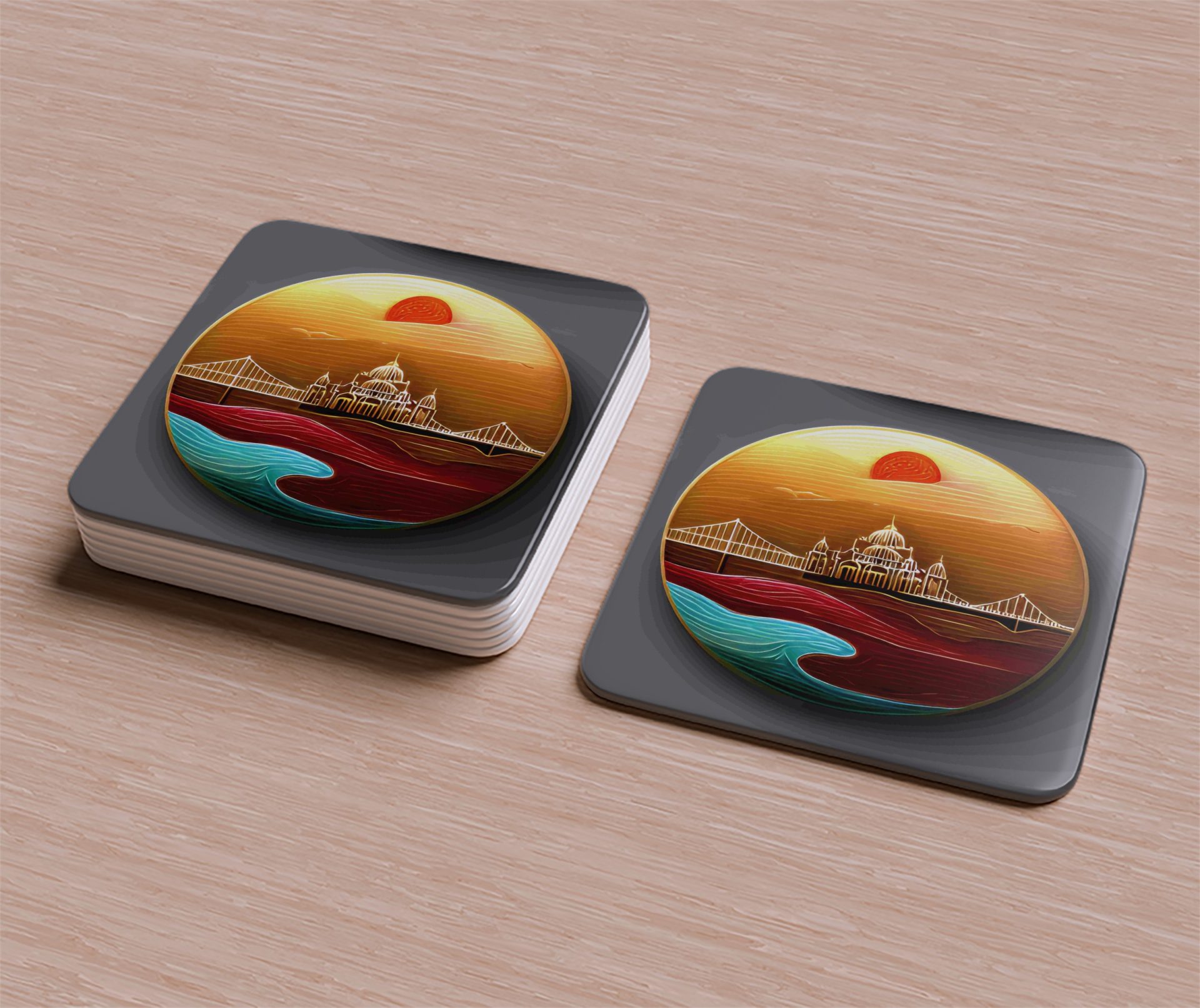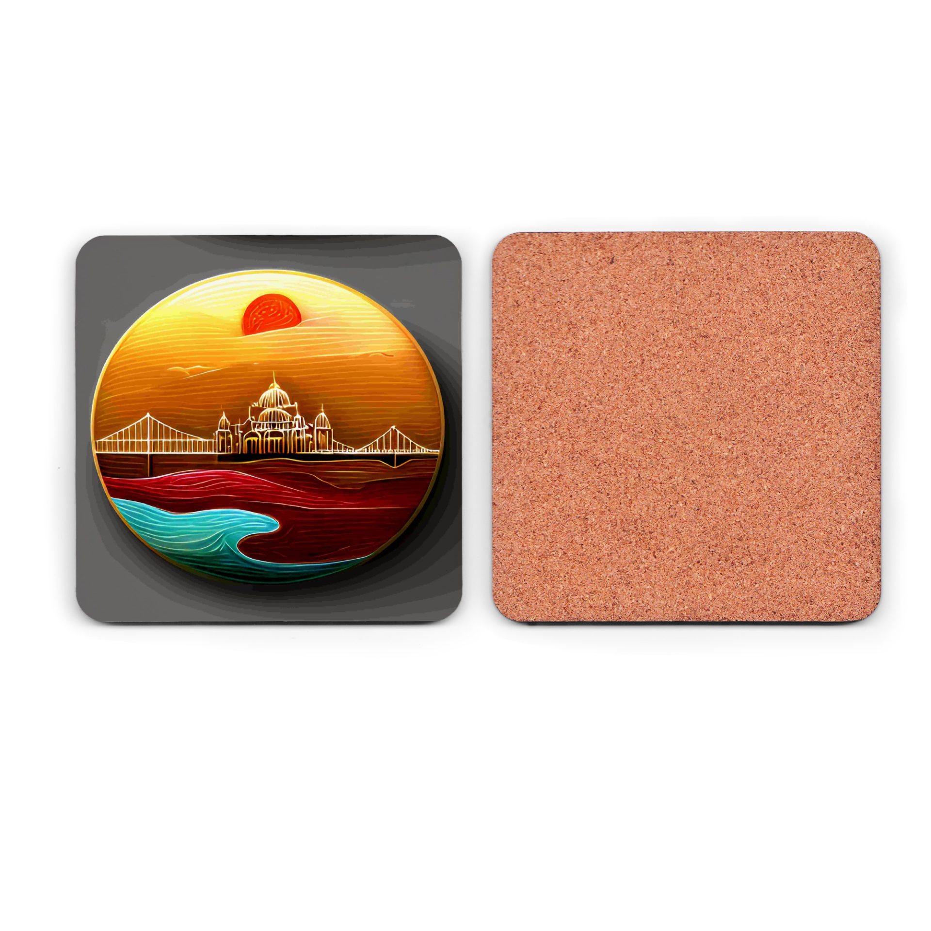 Elevate your home decor with these art style coasters featuring a bridge and city skyline under a beautiful sunrise. Perfect for adding a touch of elegance. Get yours now!