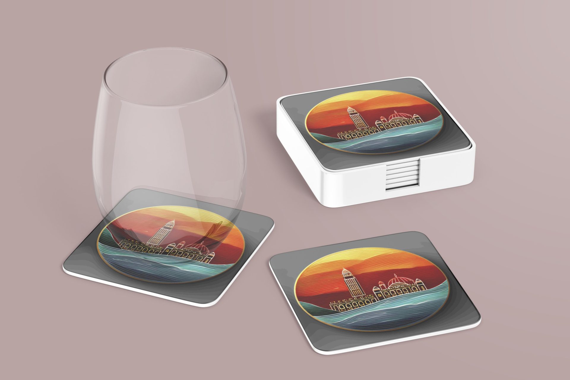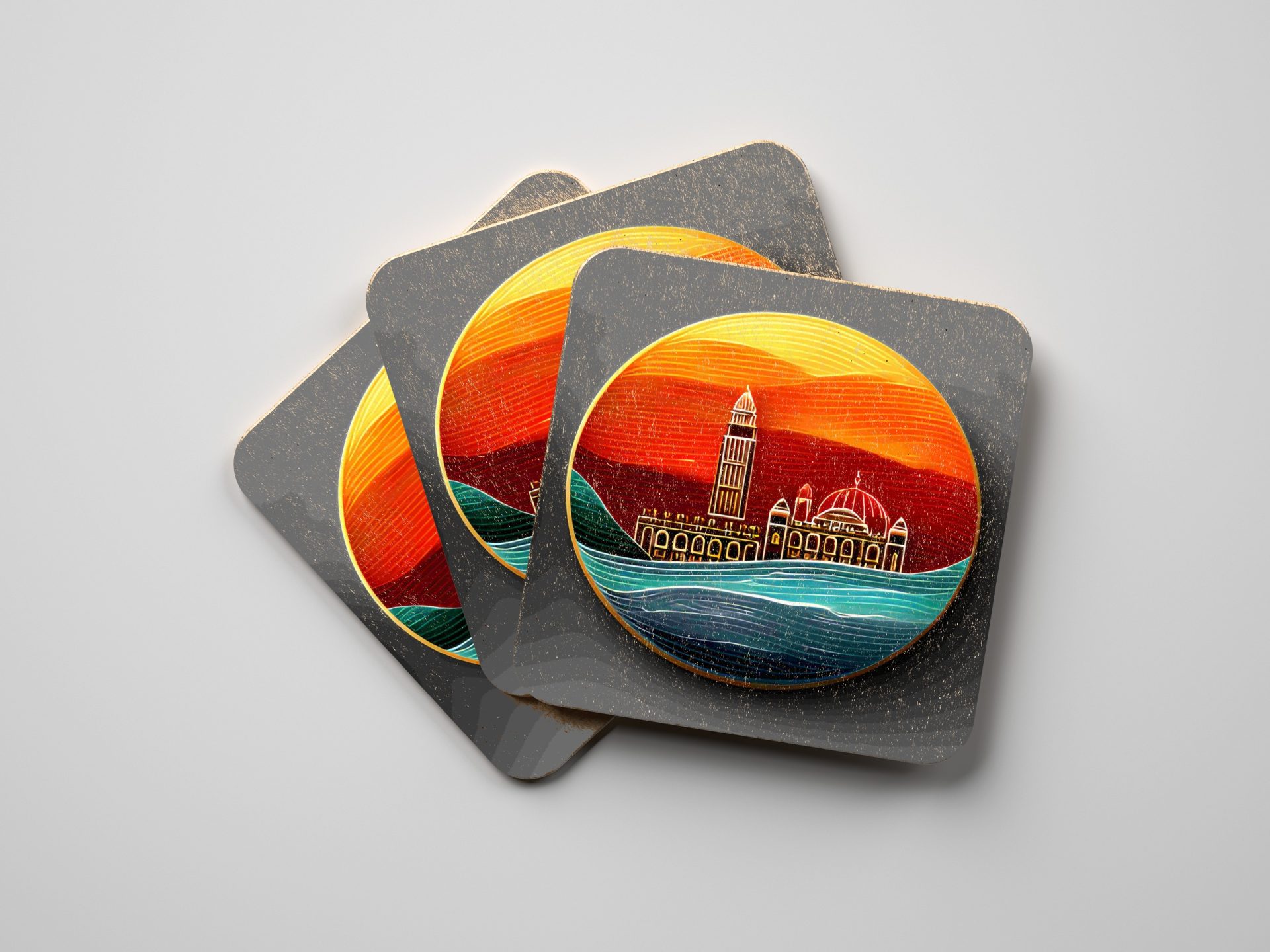 Enjoy this colorful artistic cityscape coaster design. A vivid gradient sunset provides a backdrop for an intricate city outline. Perfect accent to any living space decor.