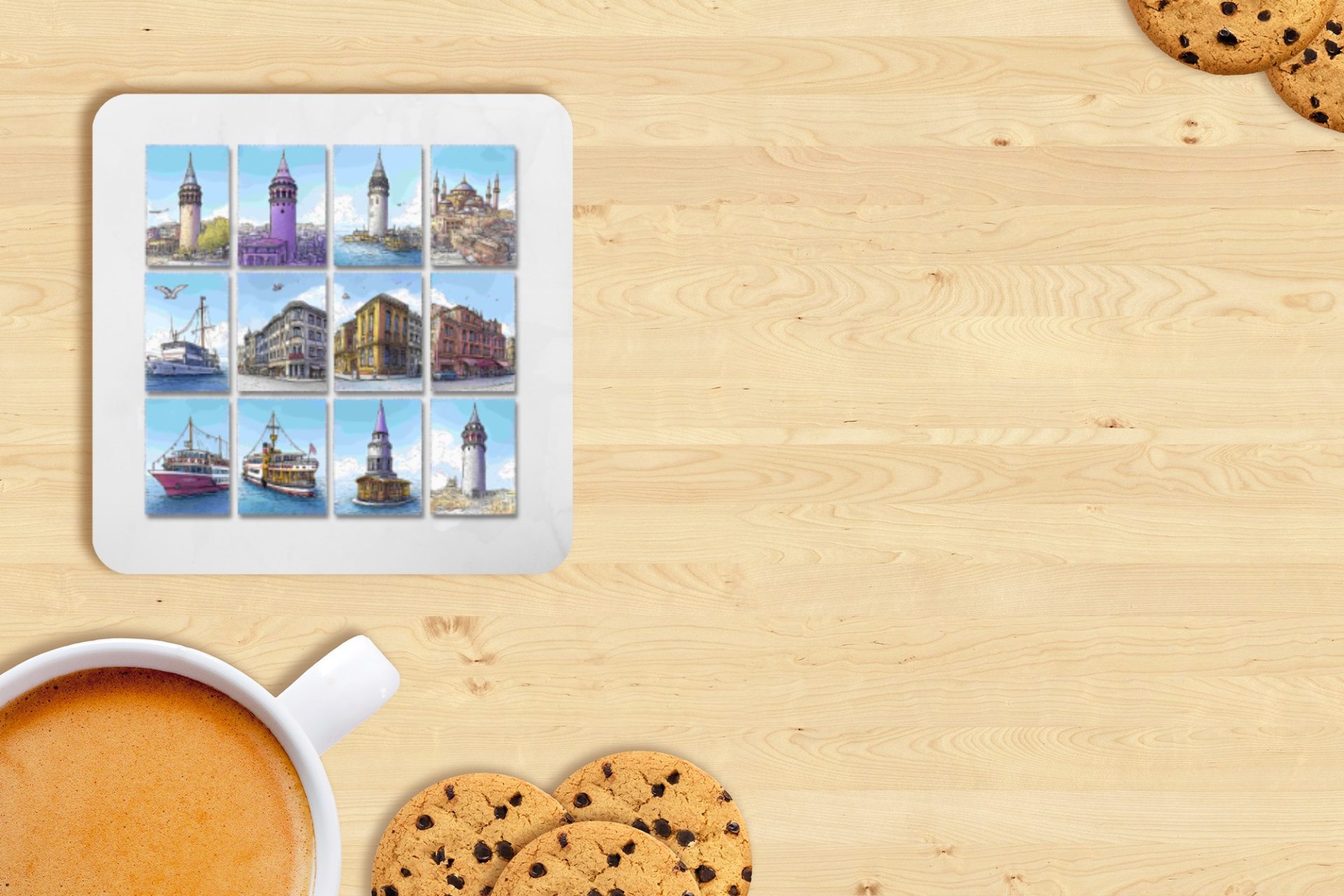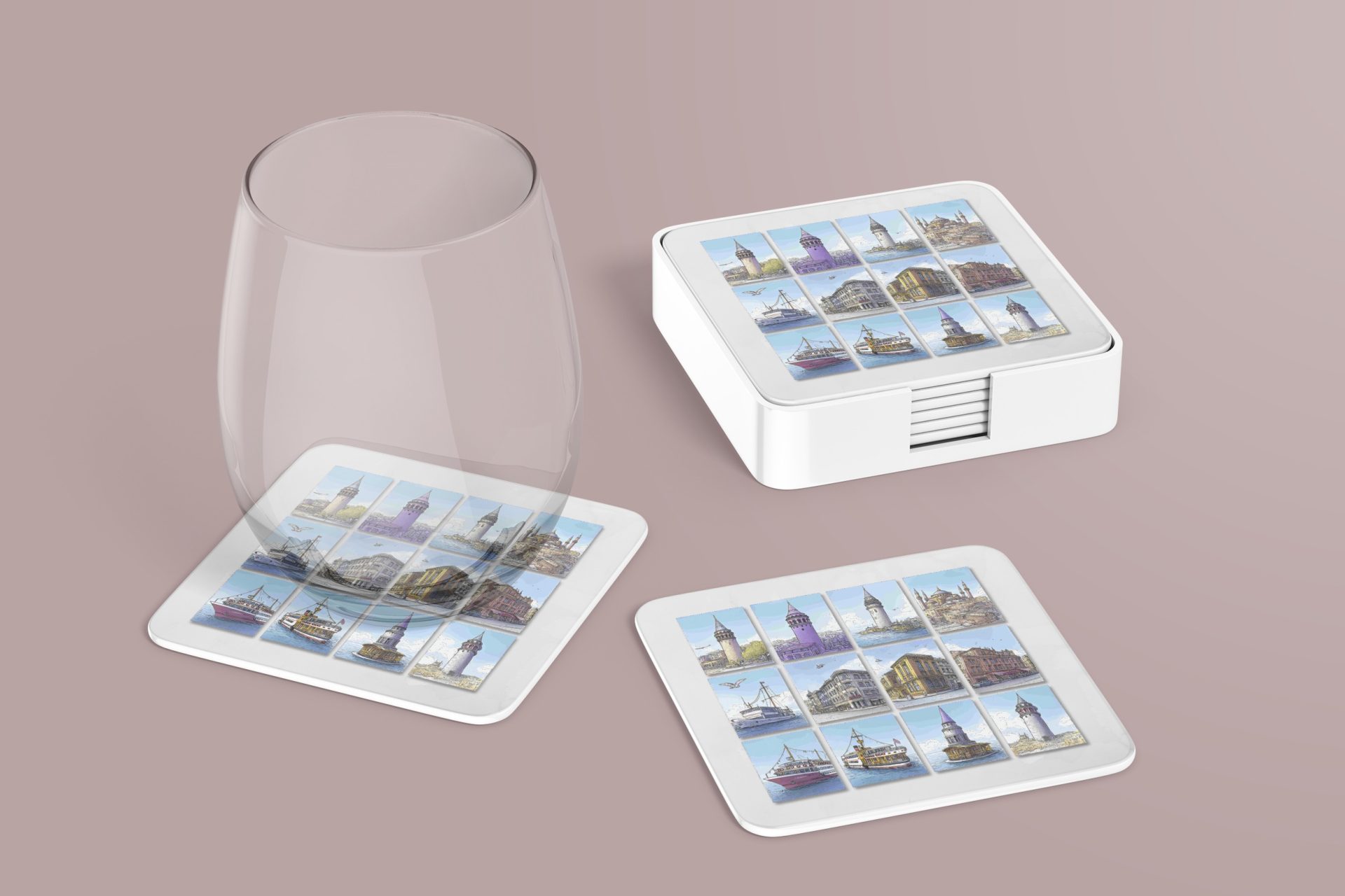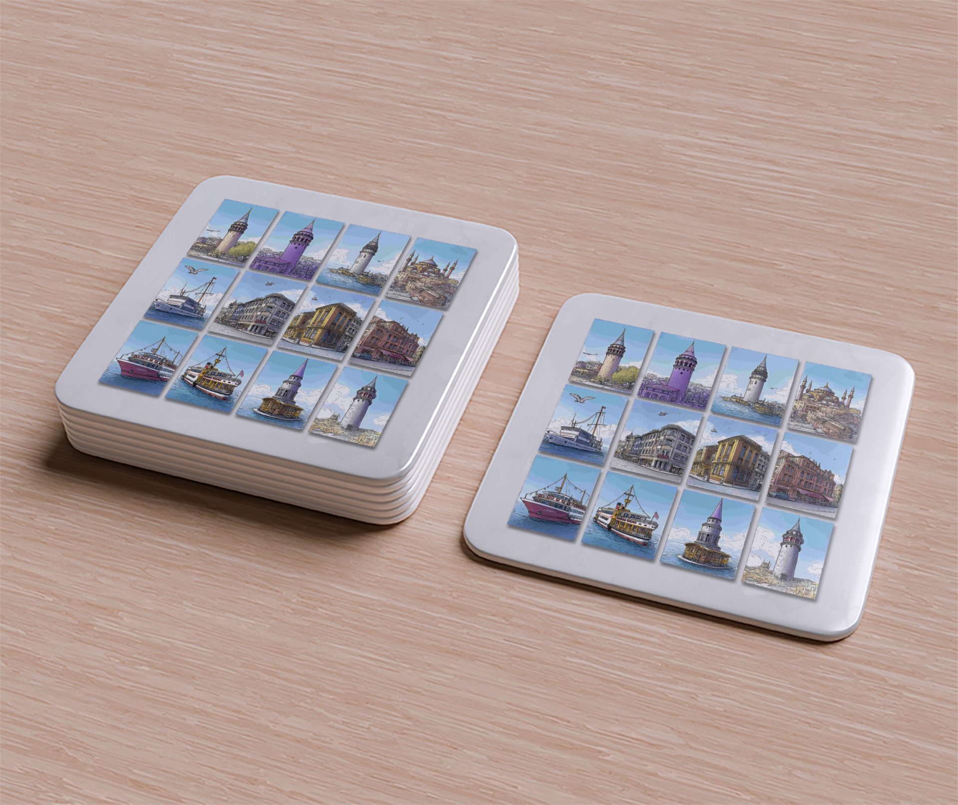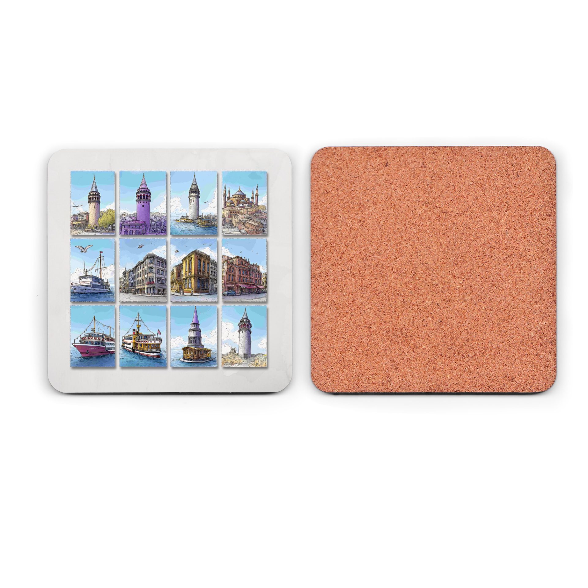 Explore the beauty history of Turkey with these gorgeous cityscape view coasters. Featuring Istanbul landmarks like the Galata Tower and ships these are sure to impress.