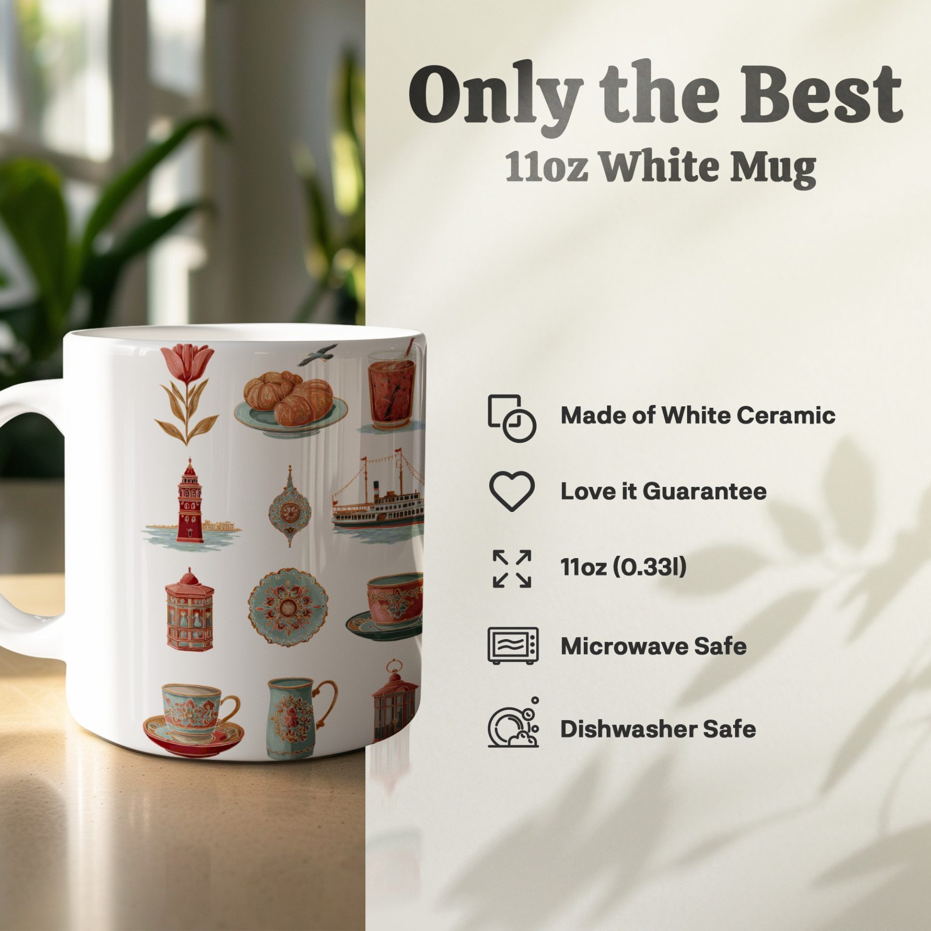 Adorned with vintage Turkish imagery this mug brings the allure of Istanbul to your tea or coffee. Perfect gift a reminder to travel or an artistic statement piece.